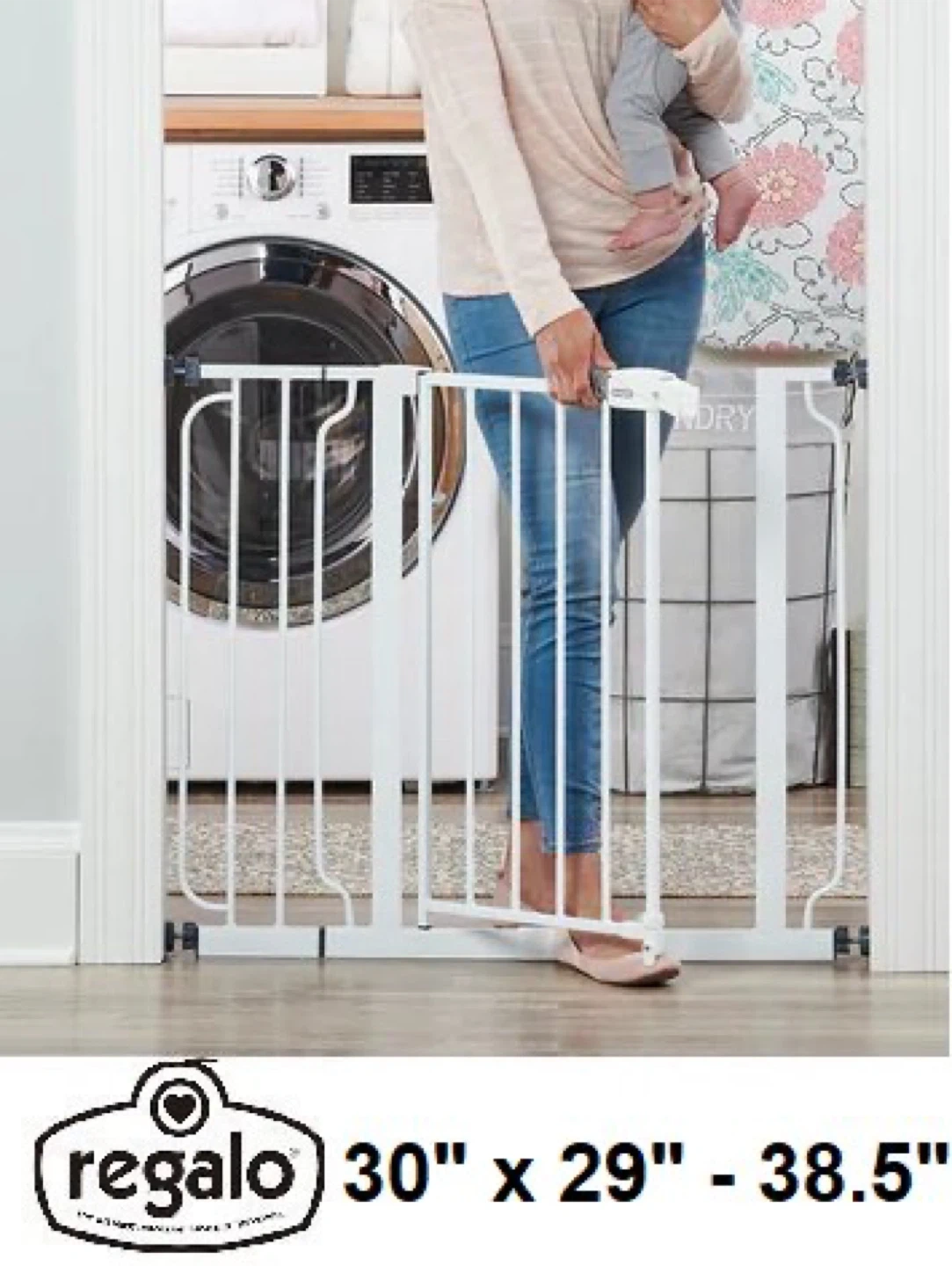 This is a white Regalo Easy Step pressure-mounted safety gate. It's suitable for openings from 73.66 cm to 97.79 cm wide. It fits openings of large size, 76.2 cm in height.