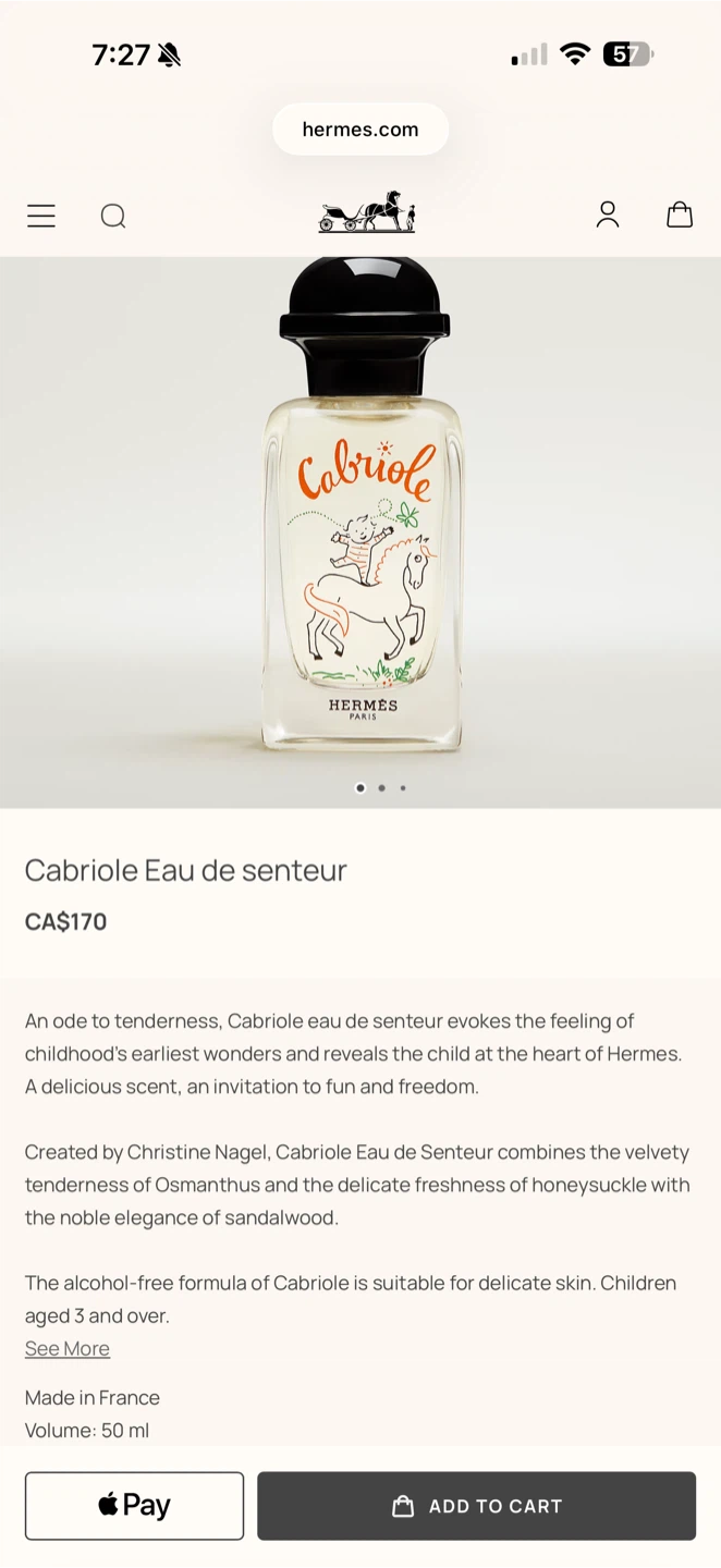 Selling a bottle of Hermès Cabriole Eau de Senteur. It's a lovely, alcohol-free fragrance suitable for delicate skin and children aged 3 and over or adults too. Main point is that it’s alcohol free so it’s suitable for sensitive skin!