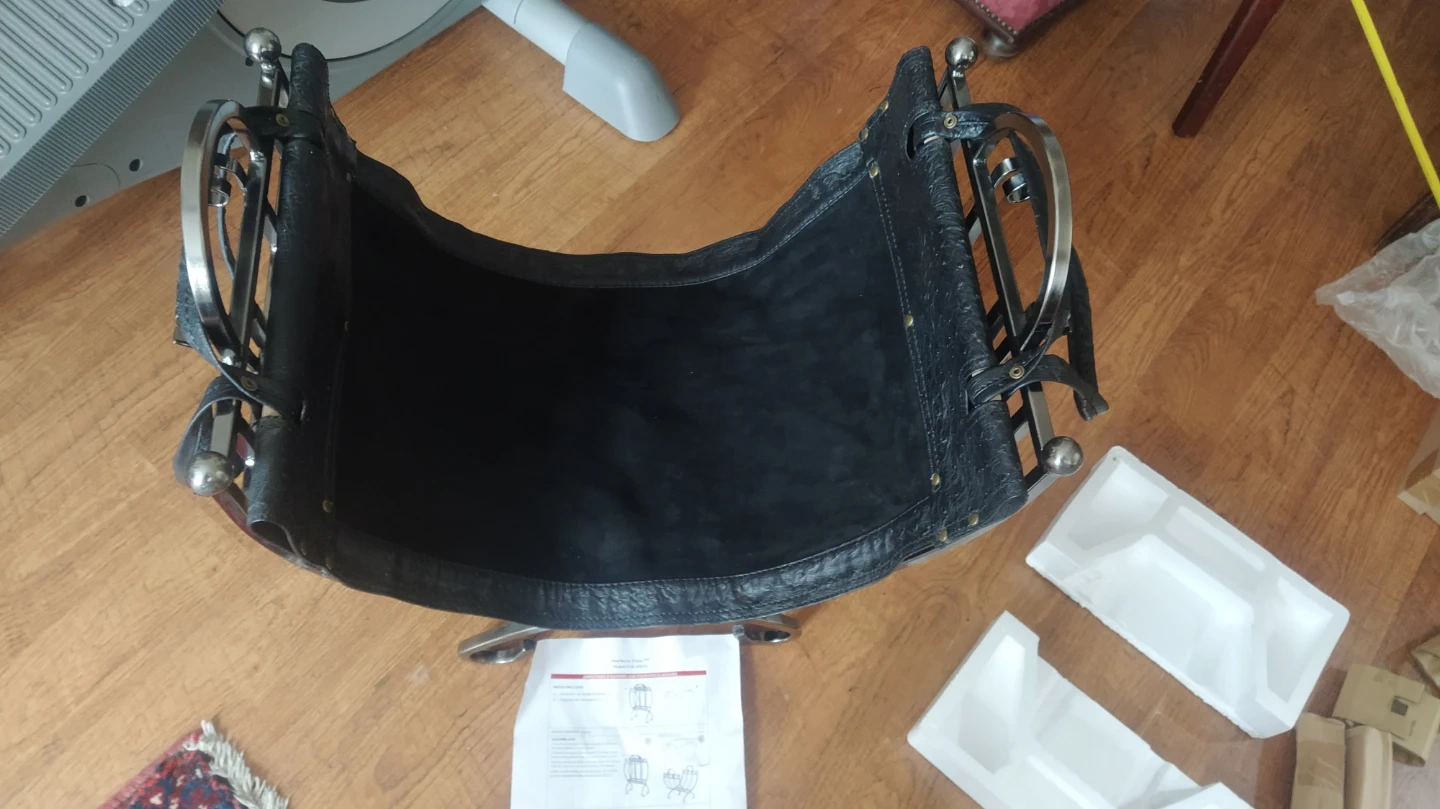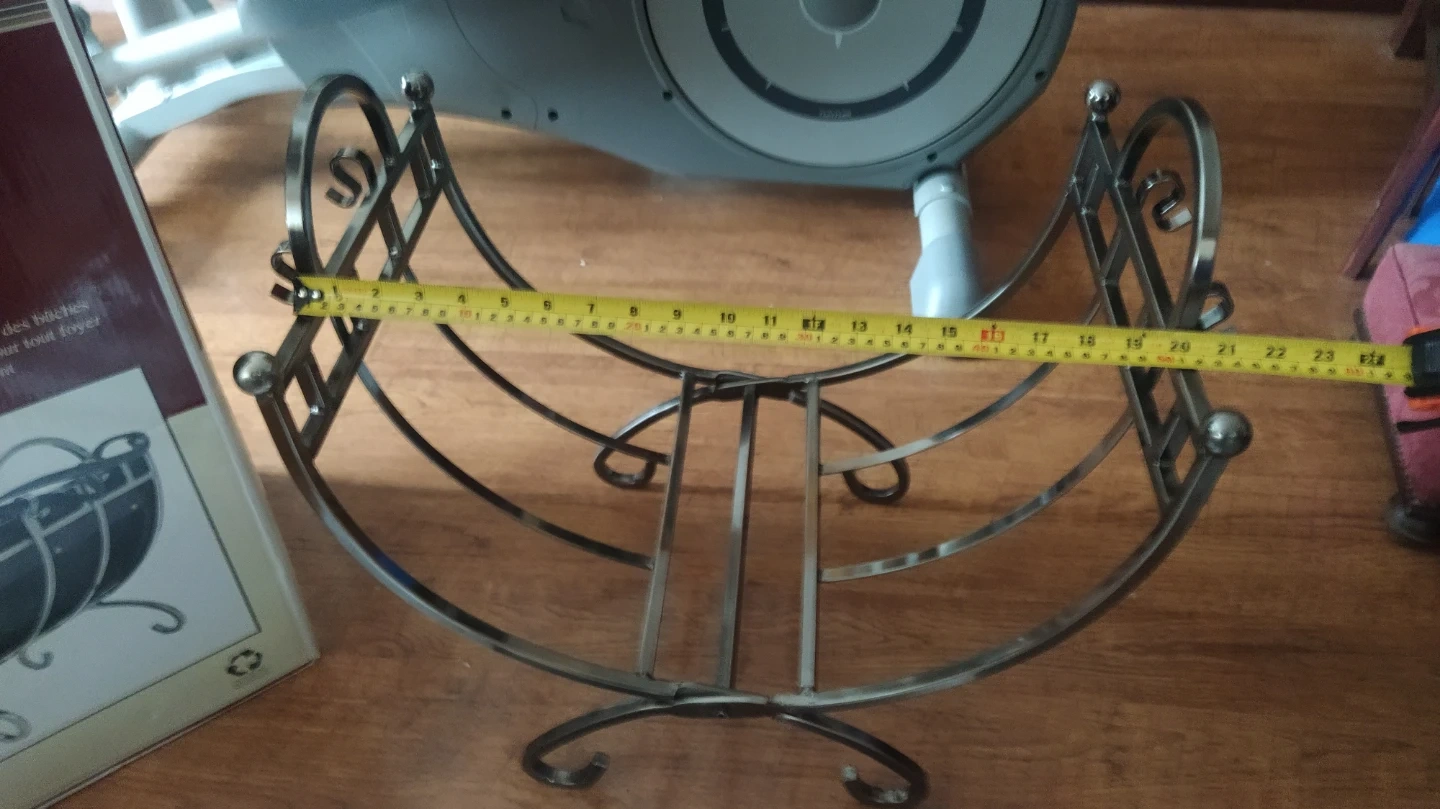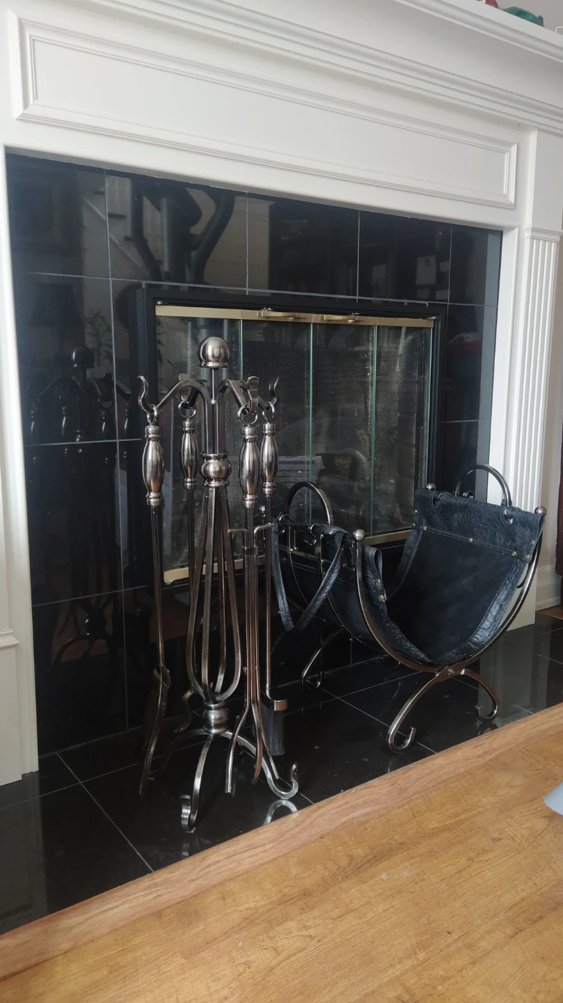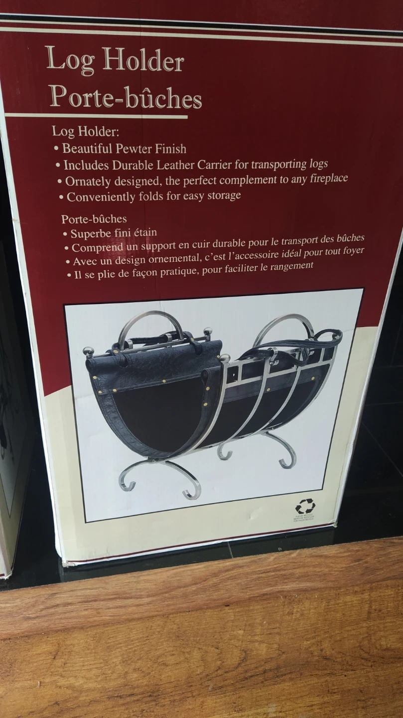 Log holder featuring a pewter finish and a durable leather carrier for transporting logs. It's ornately designed and conveniently folds for easy storage. This holder is perfect for keeping your fireplace area tidy.