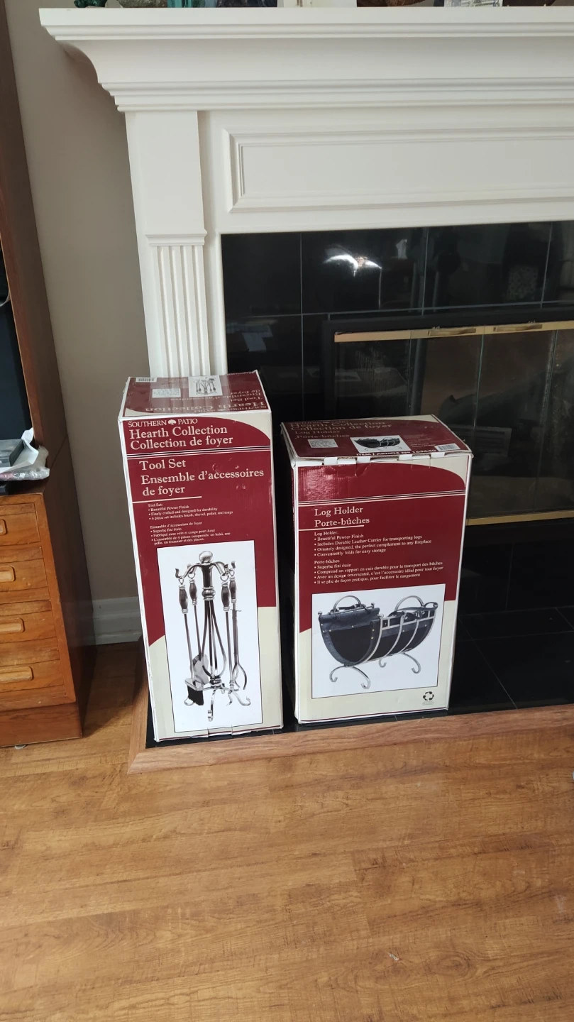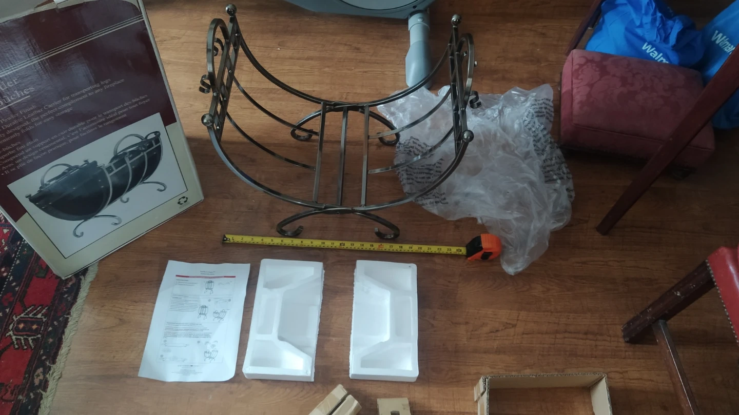 Log holder featuring a pewter finish and a durable leather carrier for transporting logs. It's ornately designed and conveniently folds for easy storage. This holder is perfect for keeping your fireplace area tidy.