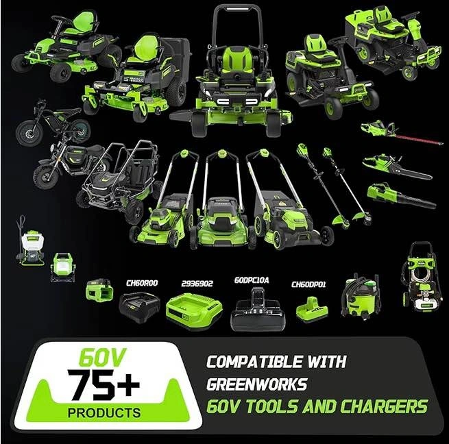 Replacement battery for Greenworks 60V cordless power tools. Compatible with models LB60A02, LB60A03, LB602, and LB6025. Offers an upgraded 5x longer runtime.