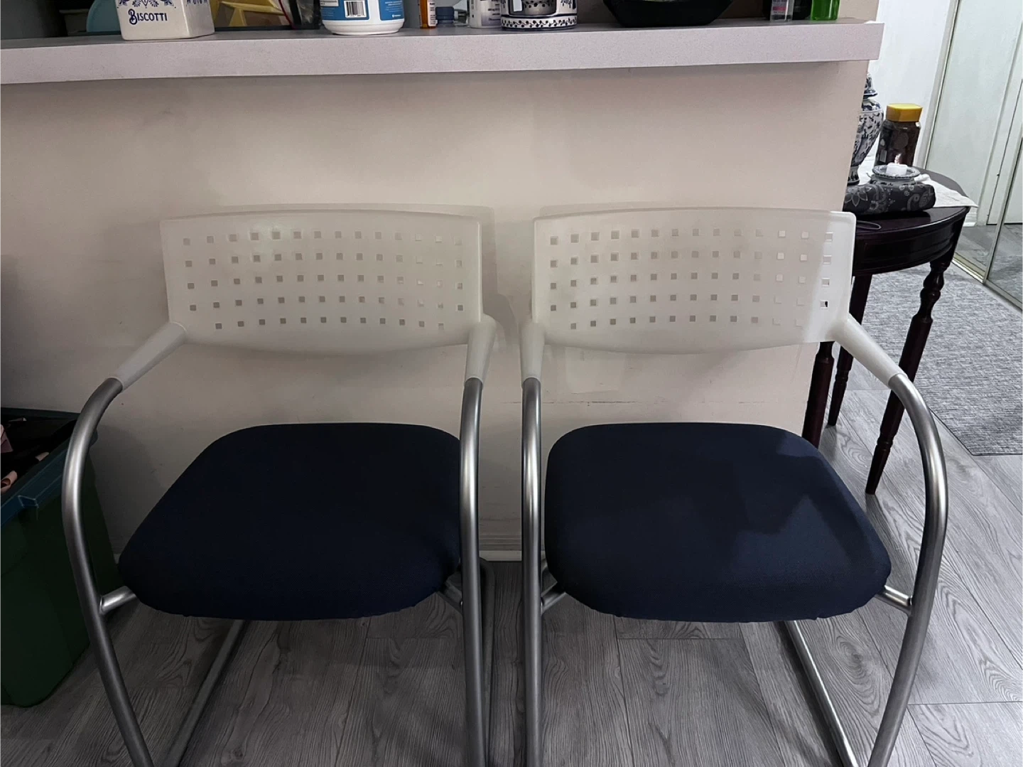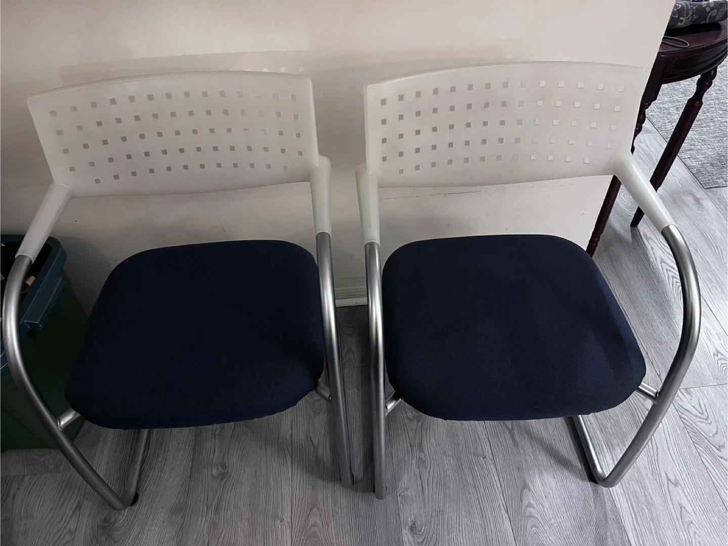 Selling a pair of chairs that would be perfect for an office or waiting room setting. They have a white plastic back and a navy blue fabric seat. The frames are a sleek silver colour. They are in good condition and ready for a new home!