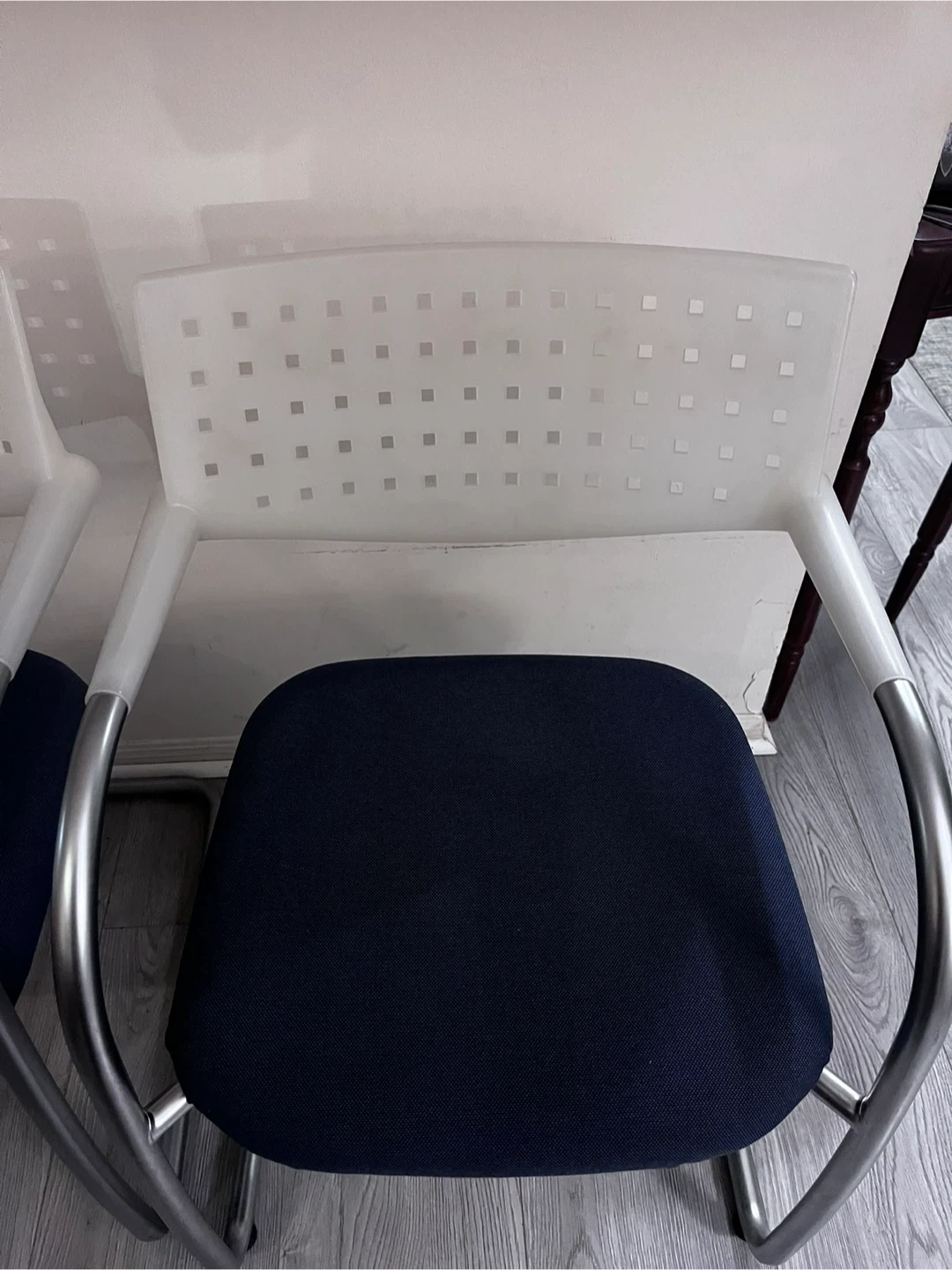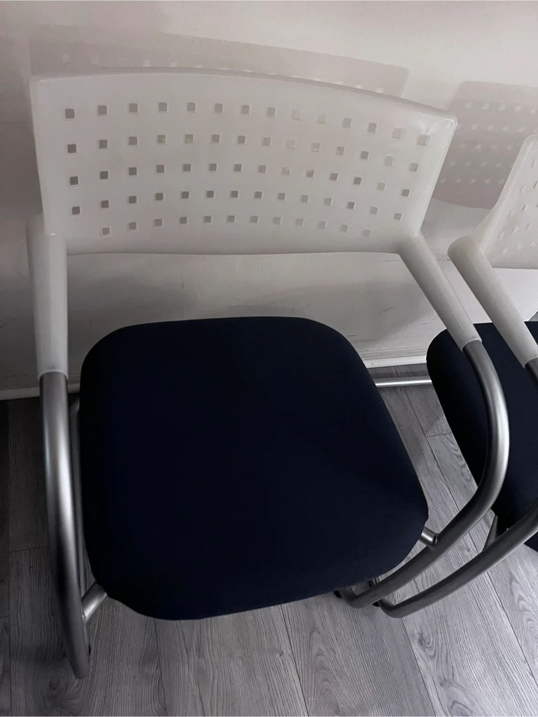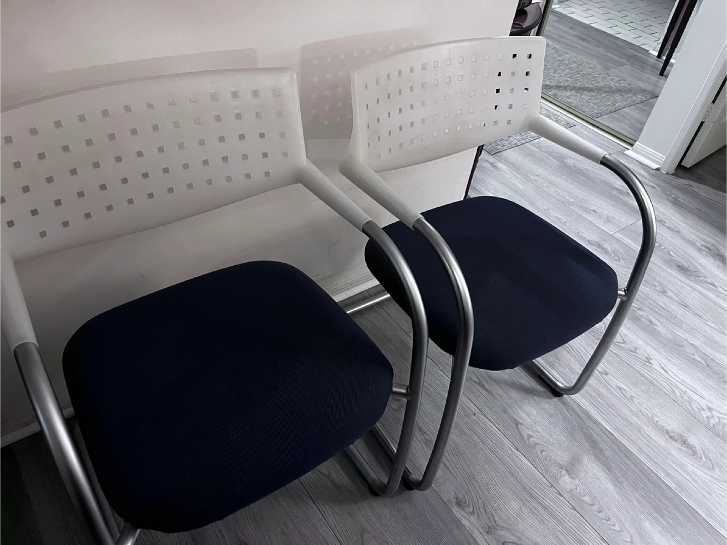 Selling a pair of chairs that would be perfect for an office or waiting room setting. They have a white plastic back and a navy blue fabric seat. The frames are a sleek silver colour. They are in good condition and ready for a new home!