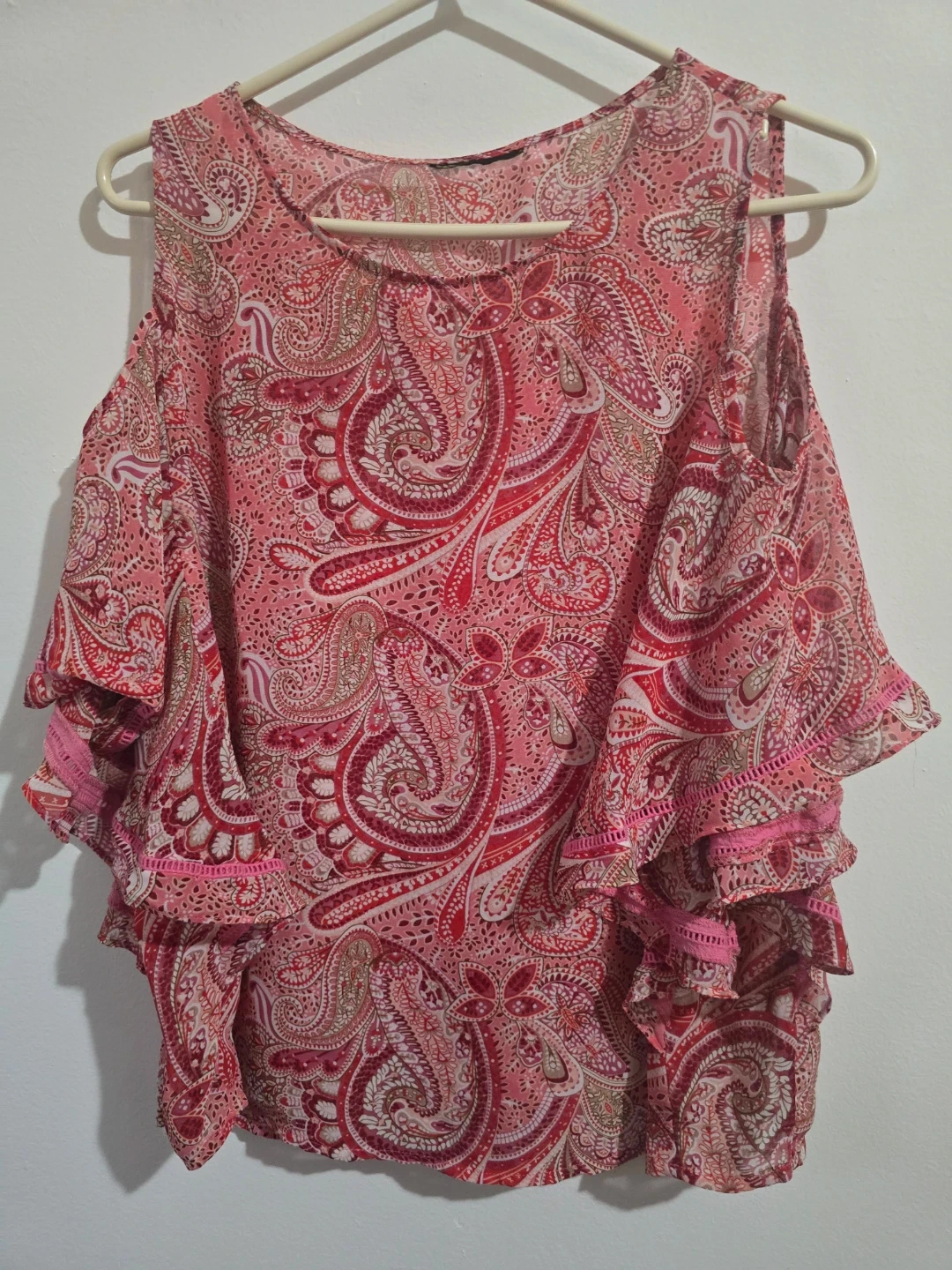 This JEANS BY BDG top features a vibrant paisley print. It's a size L with cold shoulder cutouts and ruffled sleeves. Made from 100% cotton.