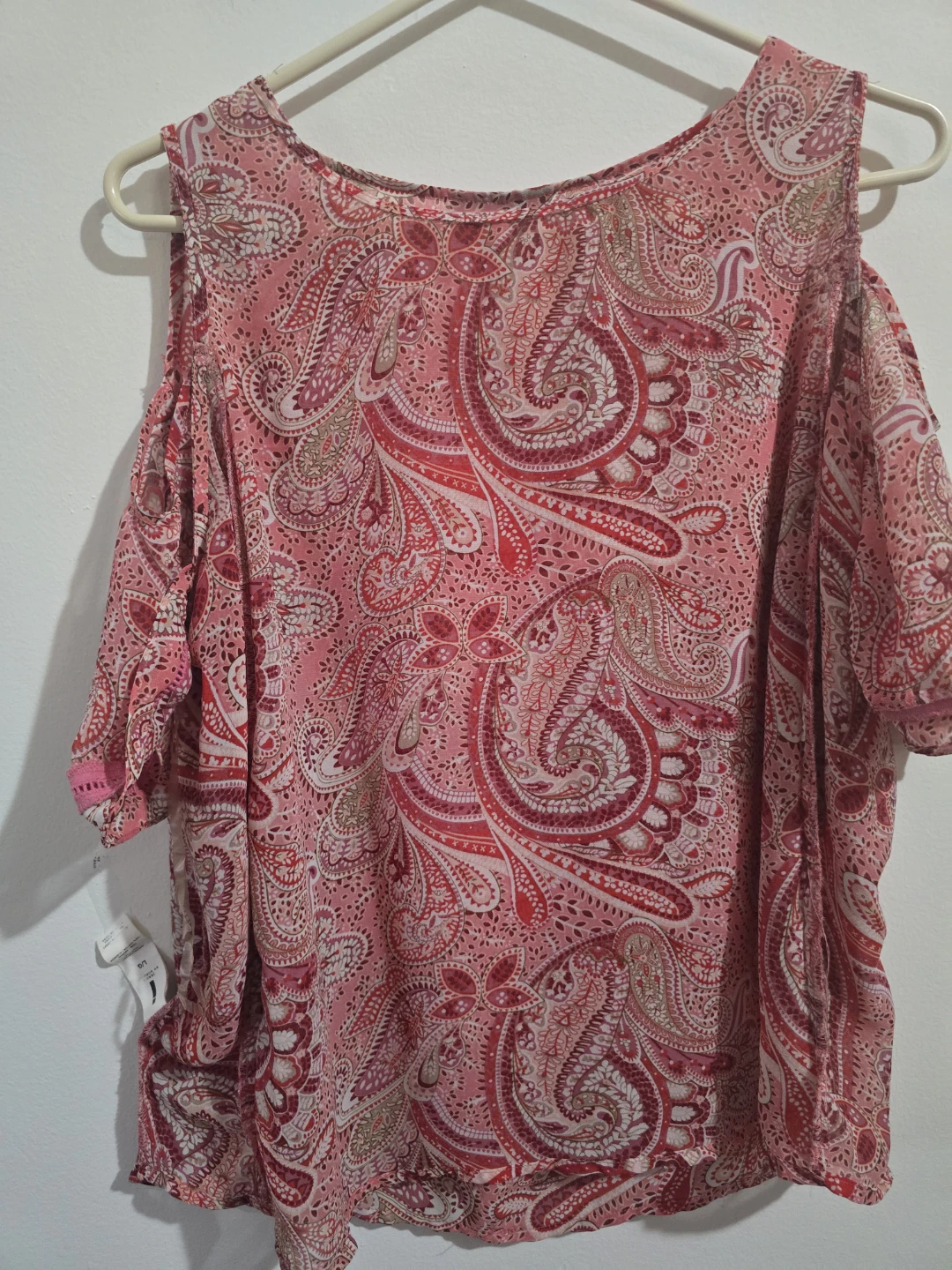 This JEANS BY BDG top features a vibrant paisley print. It's a size L with cold shoulder cutouts and ruffled sleeves. Made from 100% cotton.
