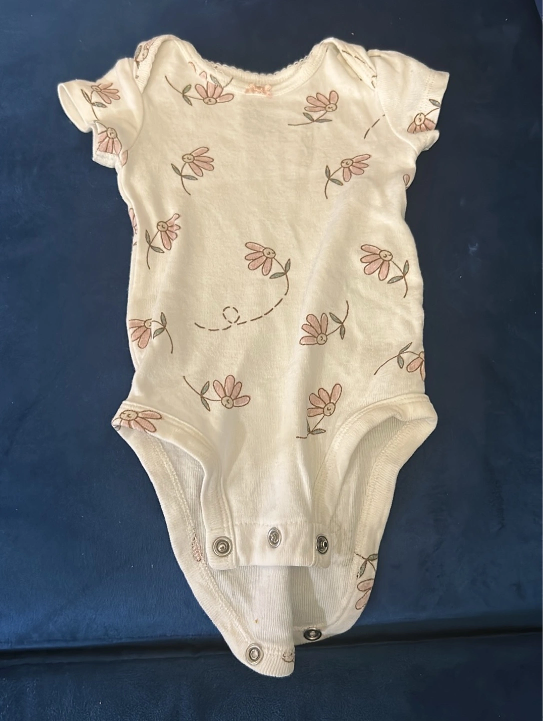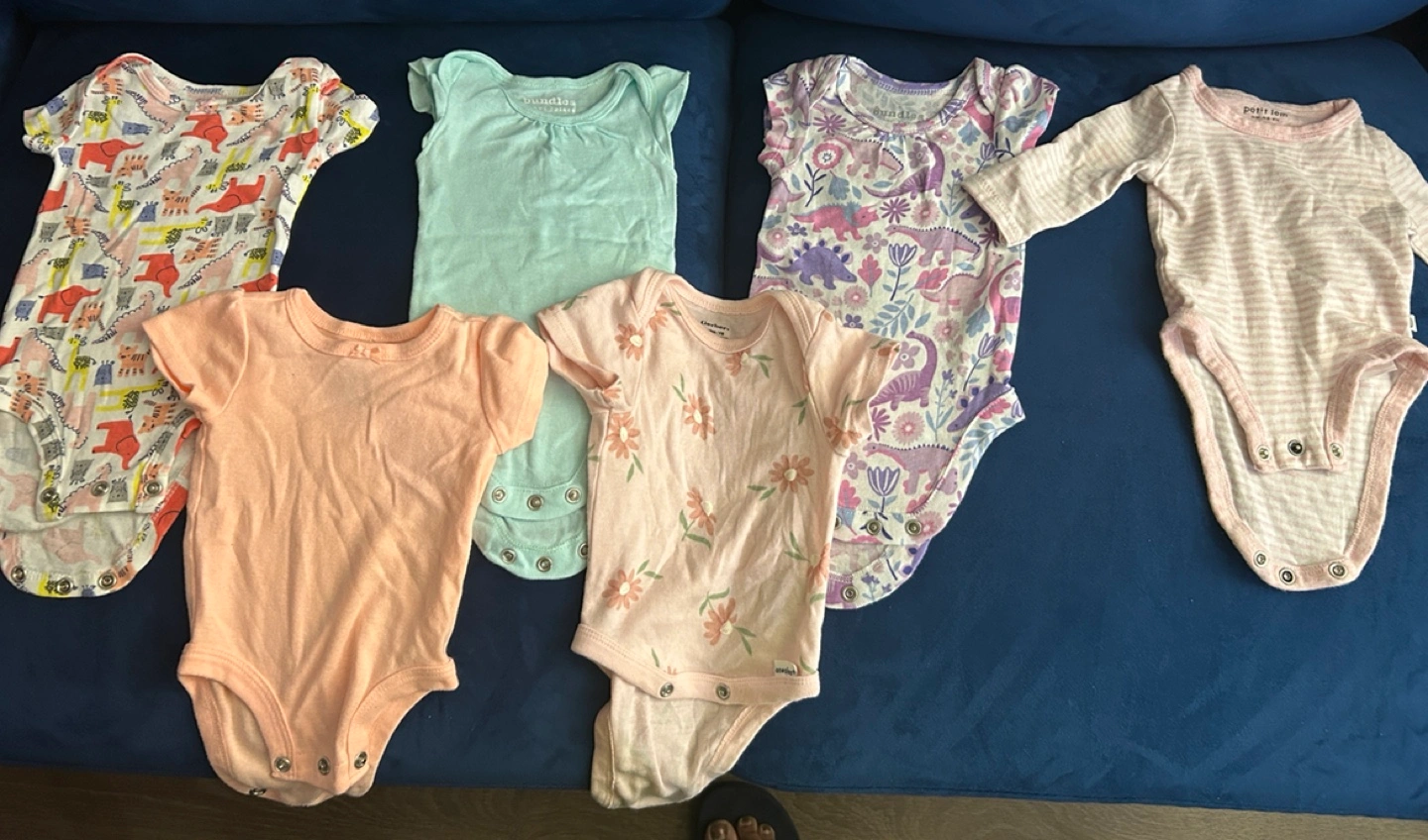 A cute collection of baby onesies in newborn size! There are 7 onesies in total, featuring a variety of colours and patterns, including dinosaurs and florals. All are in great condition and ready for a new little one