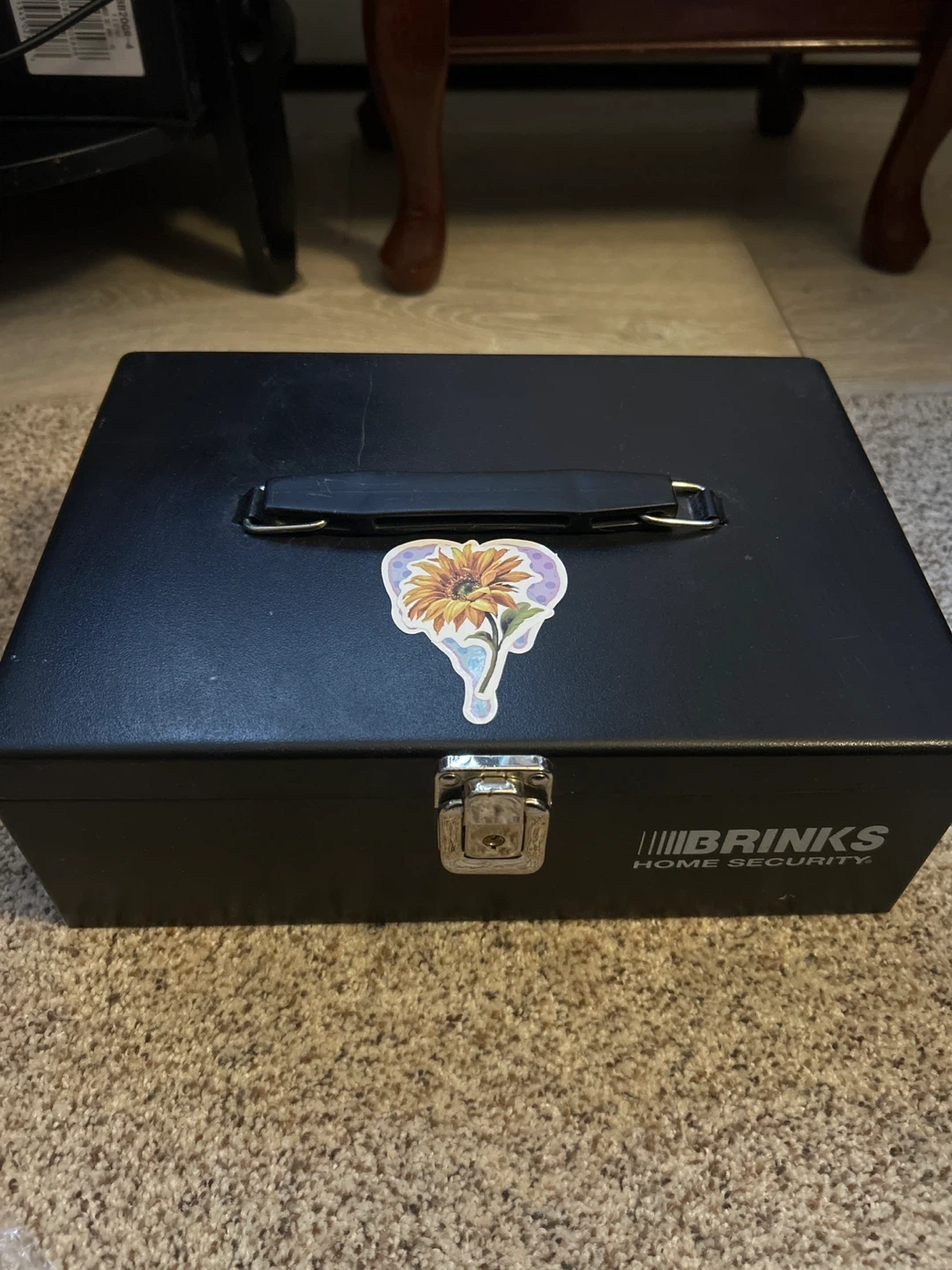 This is a black Brinks home security cash box. It's a sturdy metal box with a latch closure. It's suitable for storing cash or small valuables. Unfortunately do not have the key so it cannot lock.