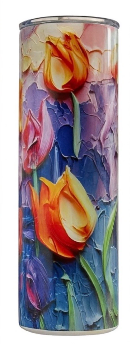 Bring a burst of colour to your day with this stunning textured floral art tumbler, featuring vibrant tulips in rich impasto‑style detail. The raised, painterly finish gives it a boutique, handcrafted feel — perfect for gifting or adding personality to your own drinkware collection. ✨ Features • 20oz stainless steel insulated tumbler • Vivid tulip artwork with textured, painterly finish • Double‑wall insulation keeps drinks hot or cold • Includes secure lid • Lightweight, durable, and easy to clean • Perfect for coffee, tea, iced drinks, or on‑the‑go hydration 💐 Condition Brand new, never used.