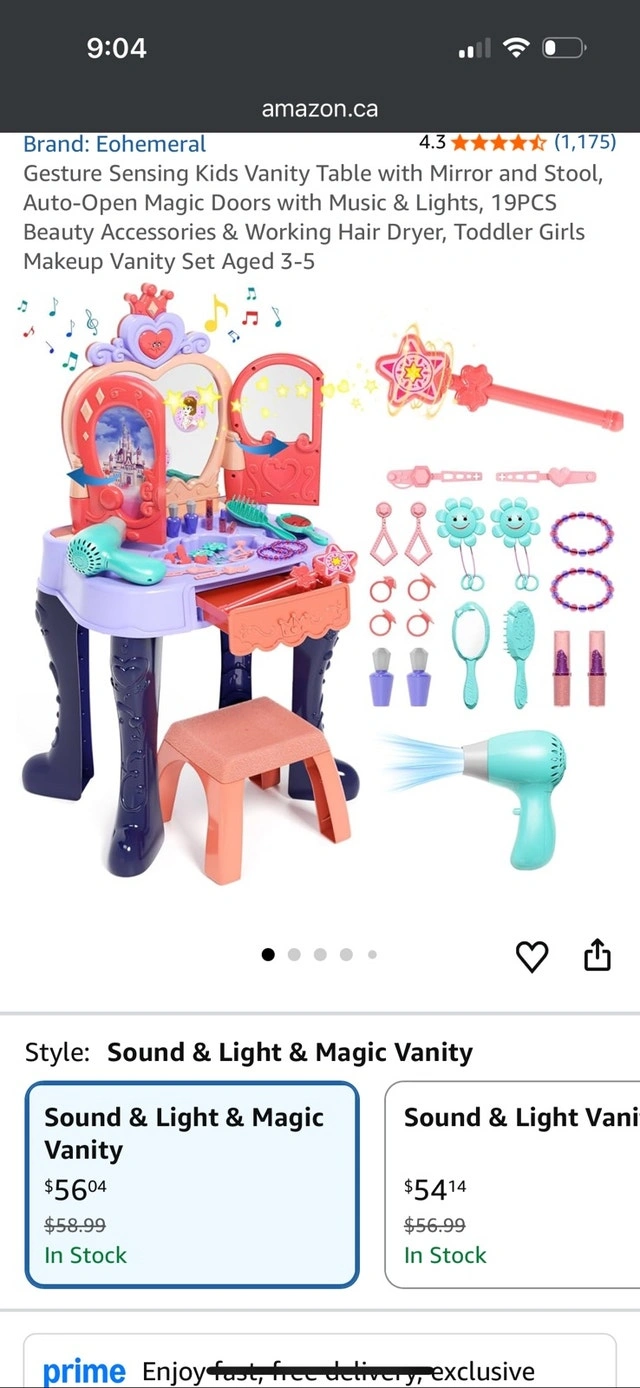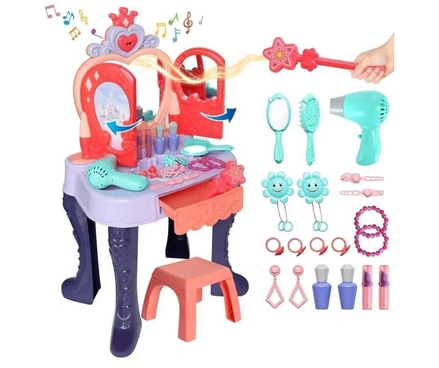 This gesture-sensing kids vanity table comes with a mirror and stool, auto-open magic doors with music and lights, beauty accessories, and a working hair dryer. It's brand new. Specifications: Sound and Light & Magic Vanity, Accessories 20 Pcs, Fairy Stick, Size: 28 inches tall. Pick up near Parkway Public School, Cambridge.