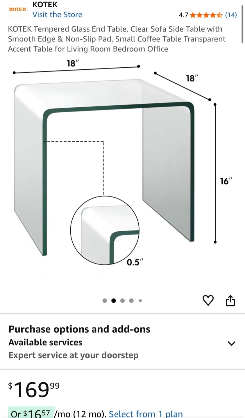 This is a KOTEK tempered glass end table. It features a clear, modern design. Dimensions are 18" x 18" x 16".