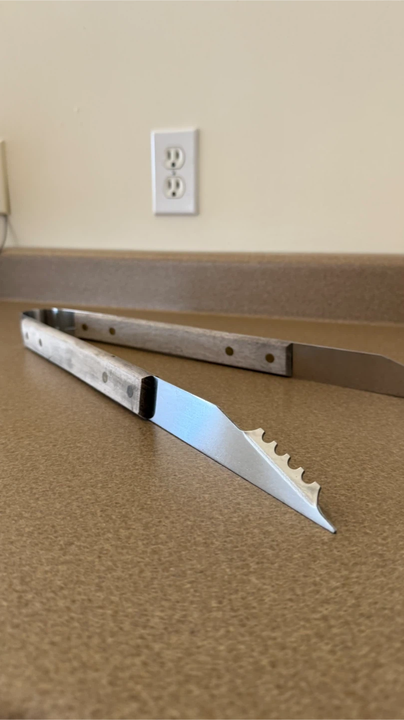 These tongs are made from durable stainless steel with a classic wooden handle design. The serrated edges provide a good grip for lifting and turning food. Great for BBQs and kitchen use!