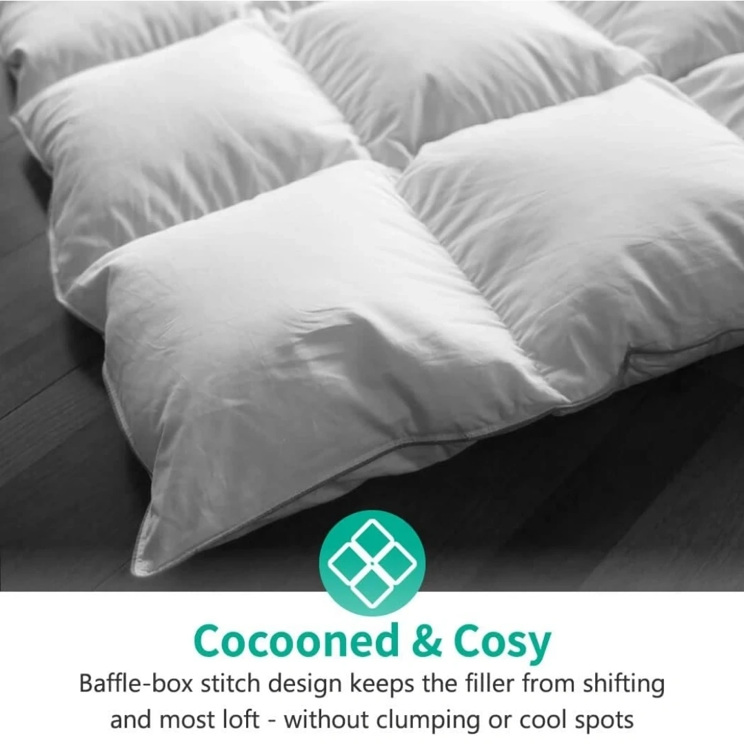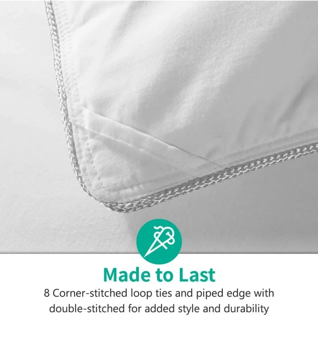 Features- Baffle box design, luxury ulta-soft 400 thread count 100% cotton, Noiseless, 8 corner tabs, breathable, Responsible Down feathers, machine washable.