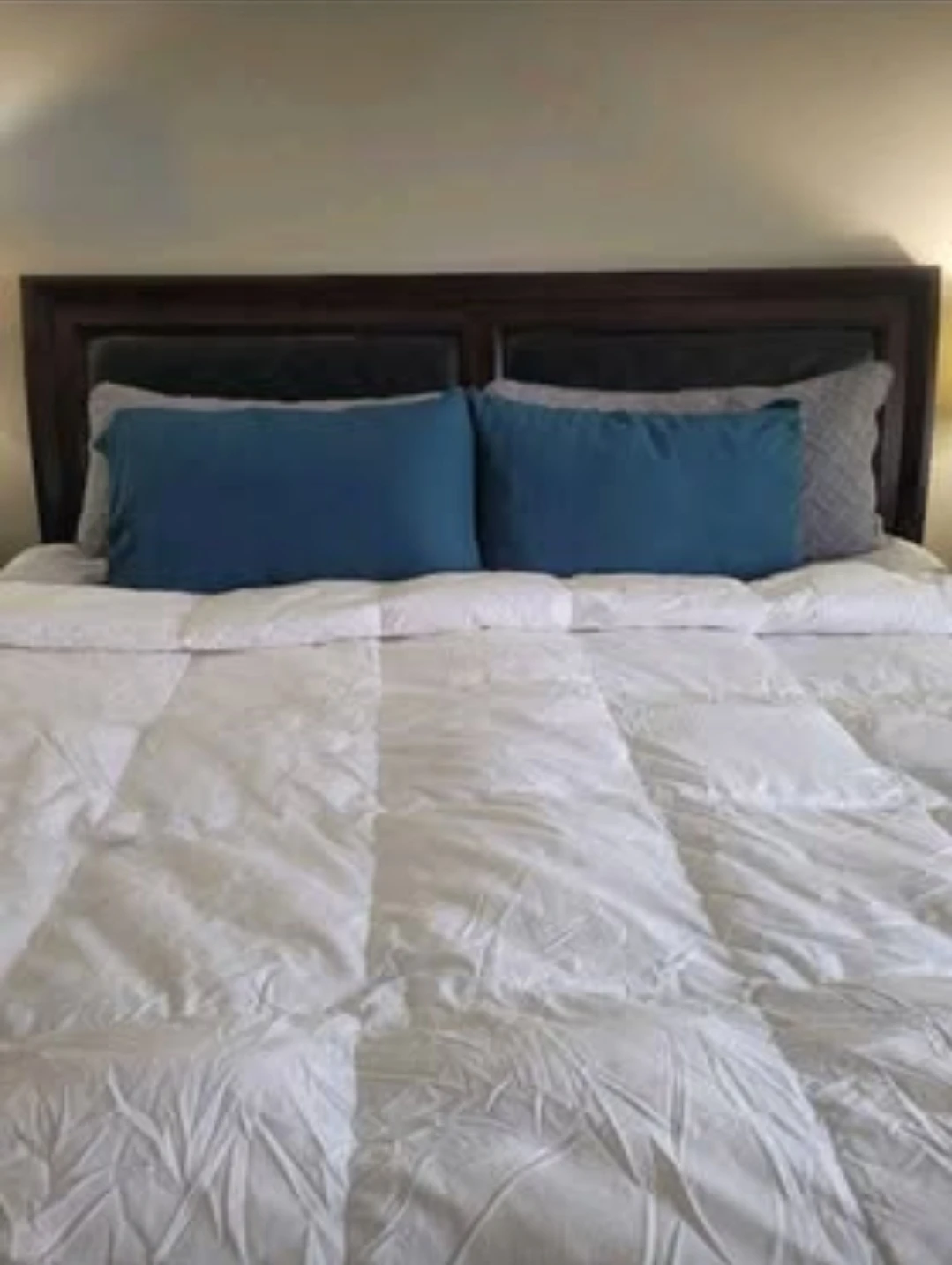 Features- Baffle box design, luxury ulta-soft 400 thread count 100% cotton, Noiseless, 8 corner tabs, breathable, Responsible Down feathers, machine washable.