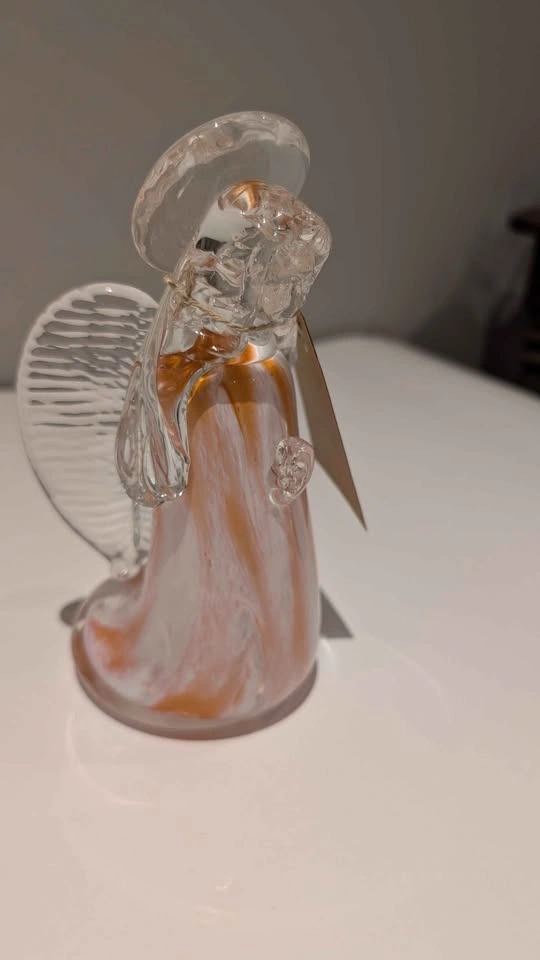 Rossi Glass hand blown angel. Rossi Glass has shut down so these are no longer available. She is in excellent condition. Clear glass with peach accents. Stamped on the bottom with the Rossi Glass "R" marking. Asking $40. Please have a look at my other listings for more vintage goodies. Thanks for looking!