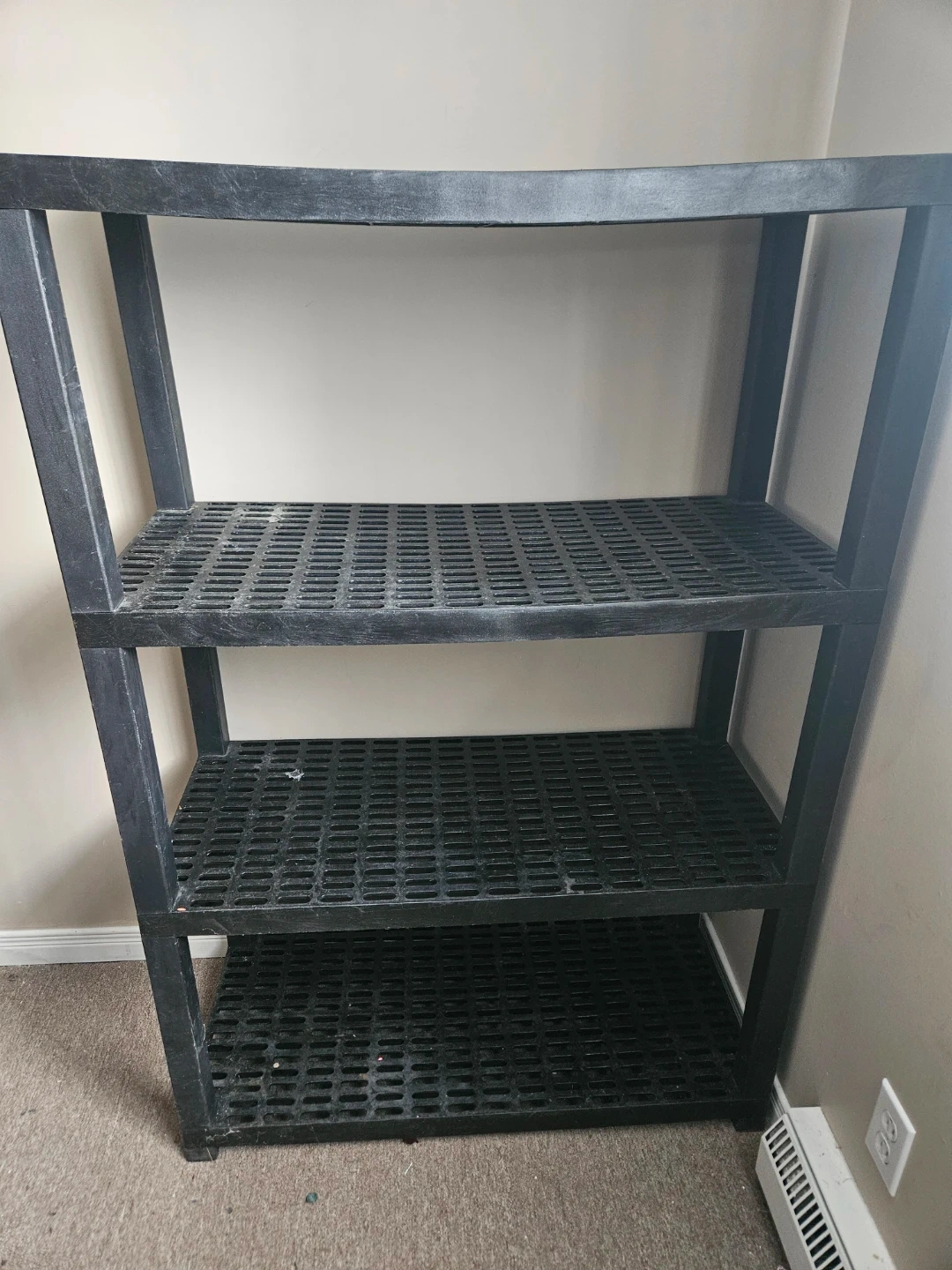 This black plastic shelving unit has four tiers. It's made of durable plastic and offers plenty of storage space. The open design allows for good air circulation.