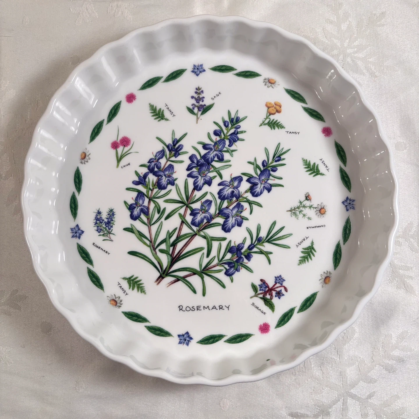 This is a lovely white tart or quiche dish featuring a detailed print of various herbs, including rosemary, sage, tansy… It has a fluted edge and appears to be made of ceramic. It's perfect for baking and serving quiches or tarts, or as a serving dish for other foods.