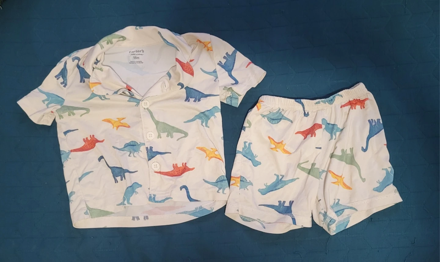 This Carter's Child of Mine pajama set features a fun all-over dinosaur print. It includes a short-sleeved button-up top and matching shorts. Size is 18 months. It's made from comfy cotton.