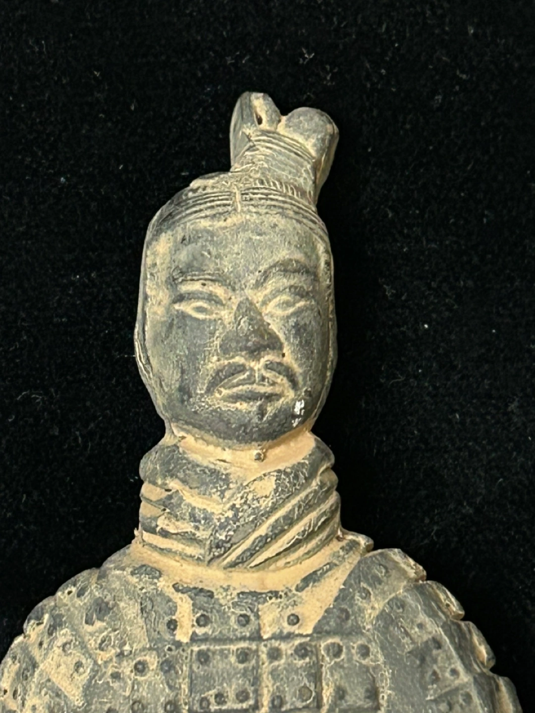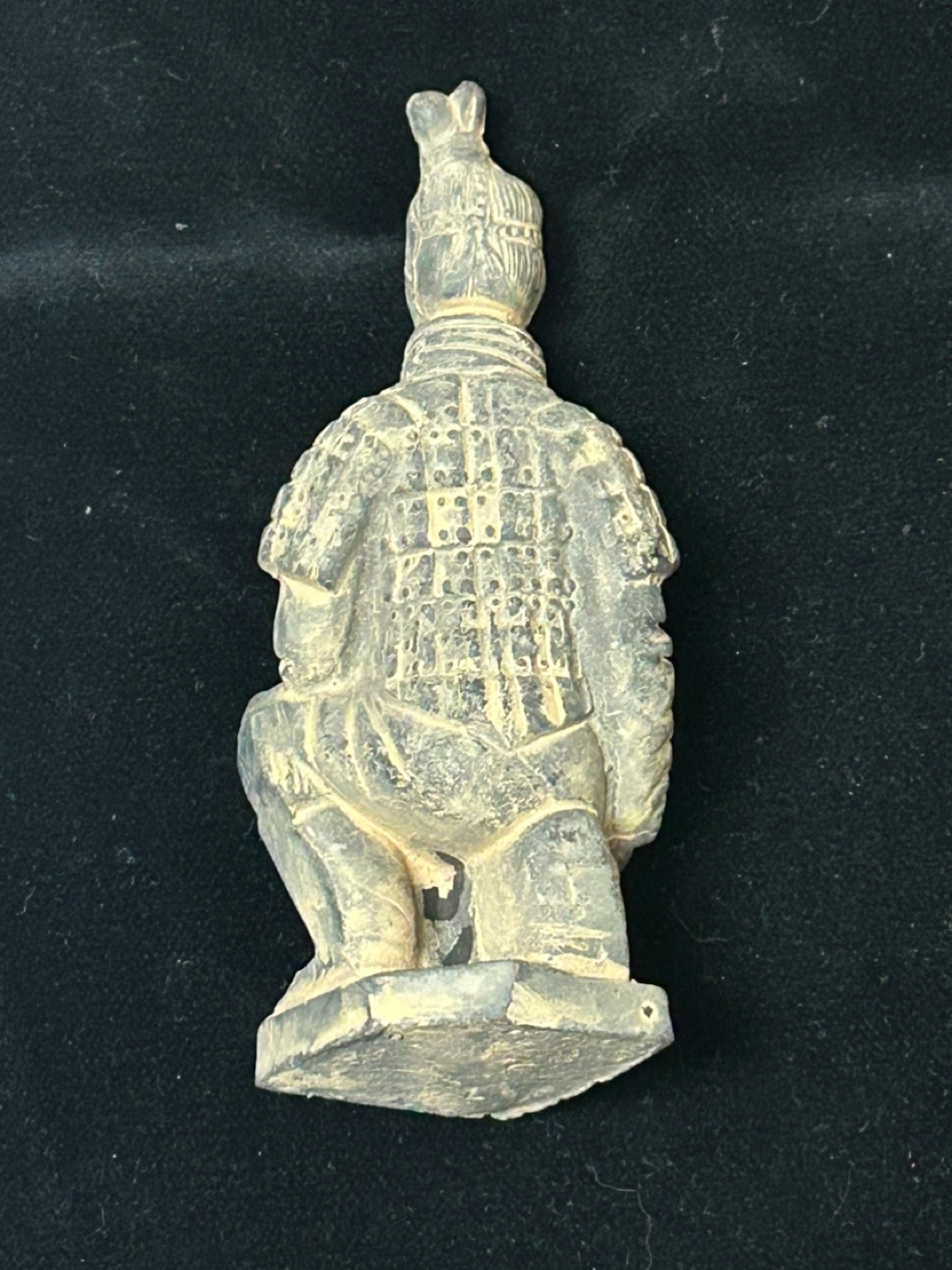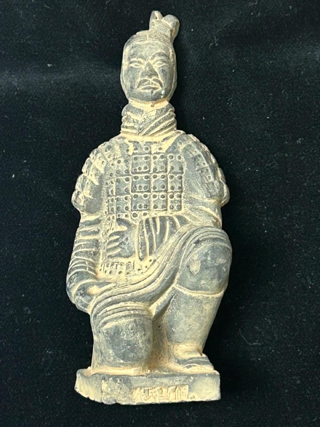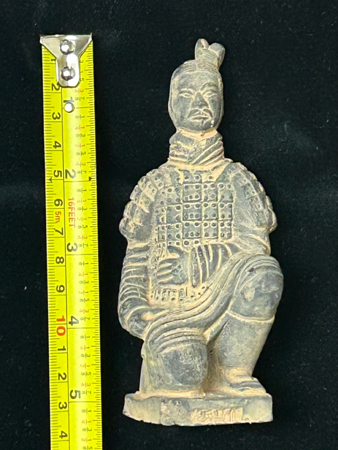 Small, grey terracotta statue. Depicts a kneeling warrior in armour. Detailed facial features and clothing. Shows some wear. Base marked with Chinese characters.