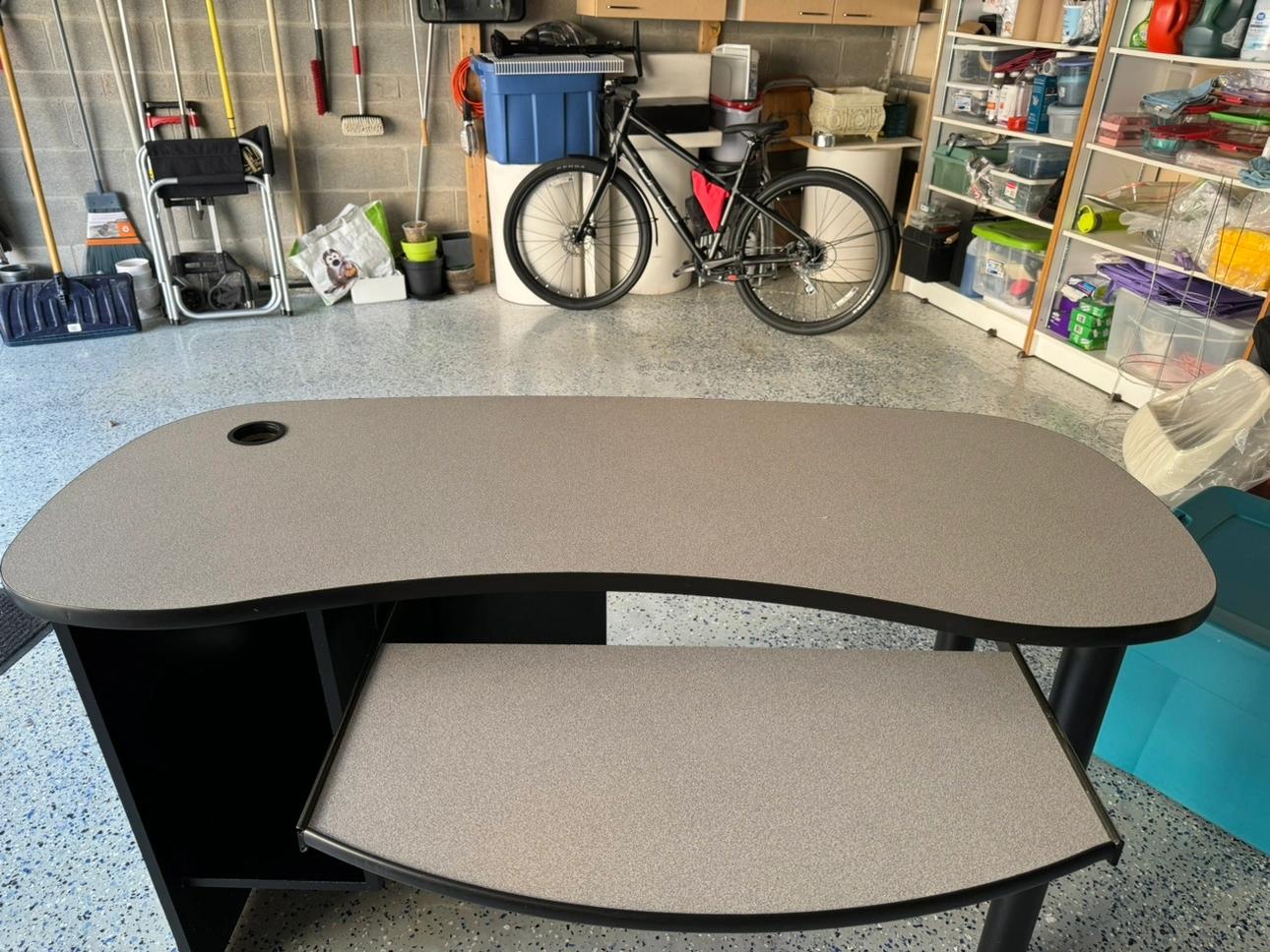 A computer desk with a curved front and a keyboard tray. It has a hole in the top for cable management.