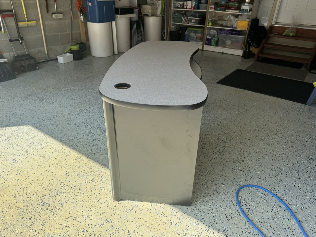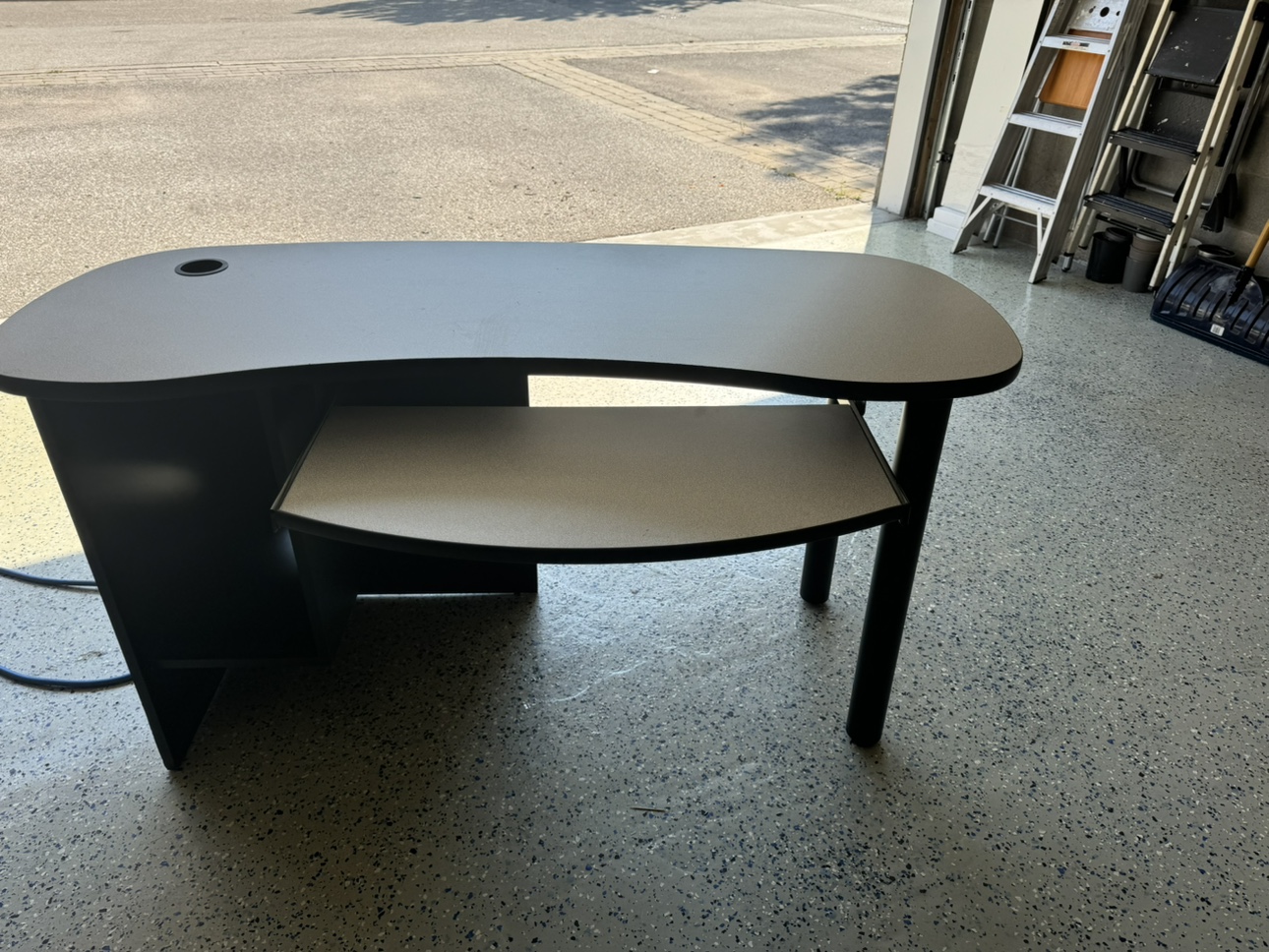 A computer desk with a curved front and a keyboard tray. It has a hole in the top for cable management.
