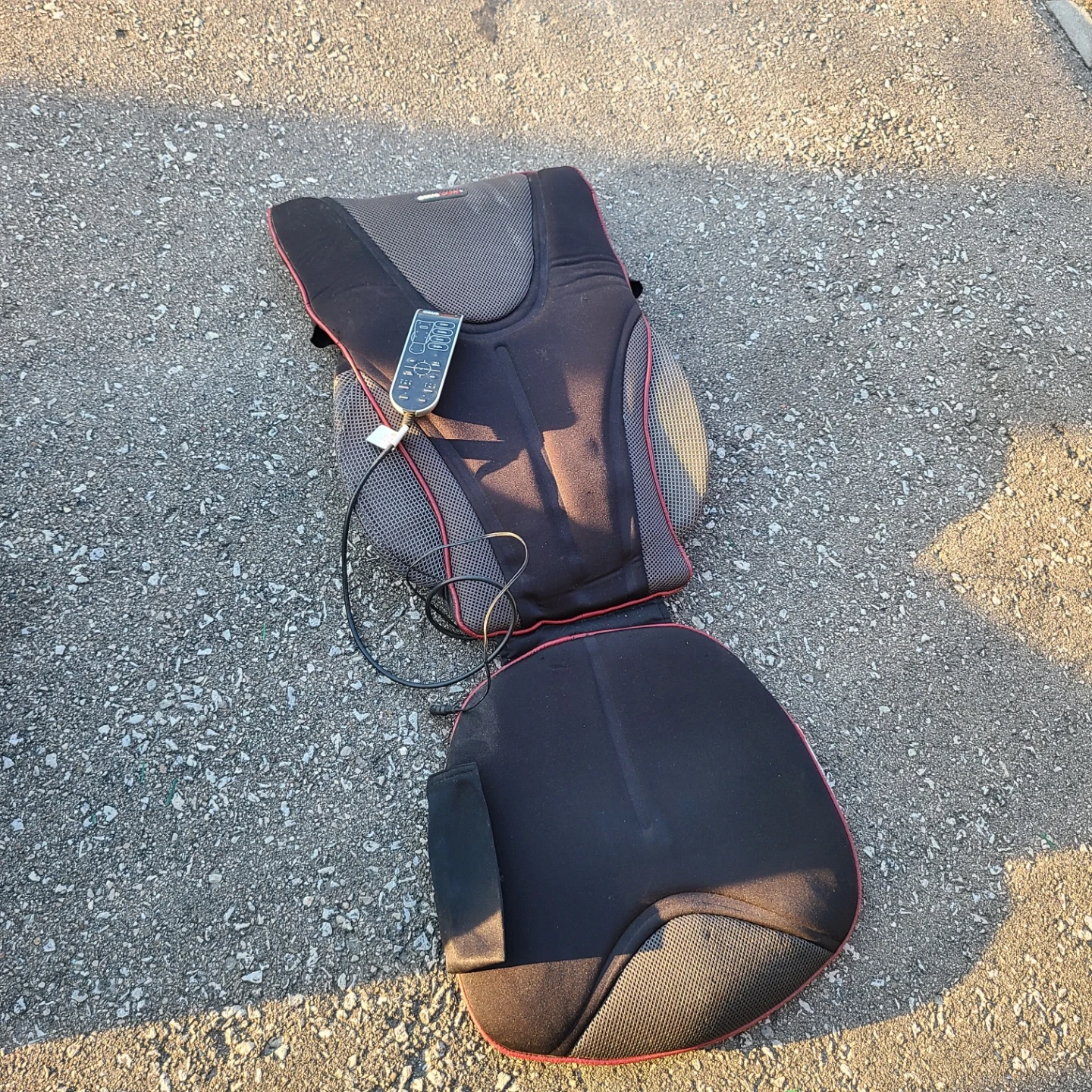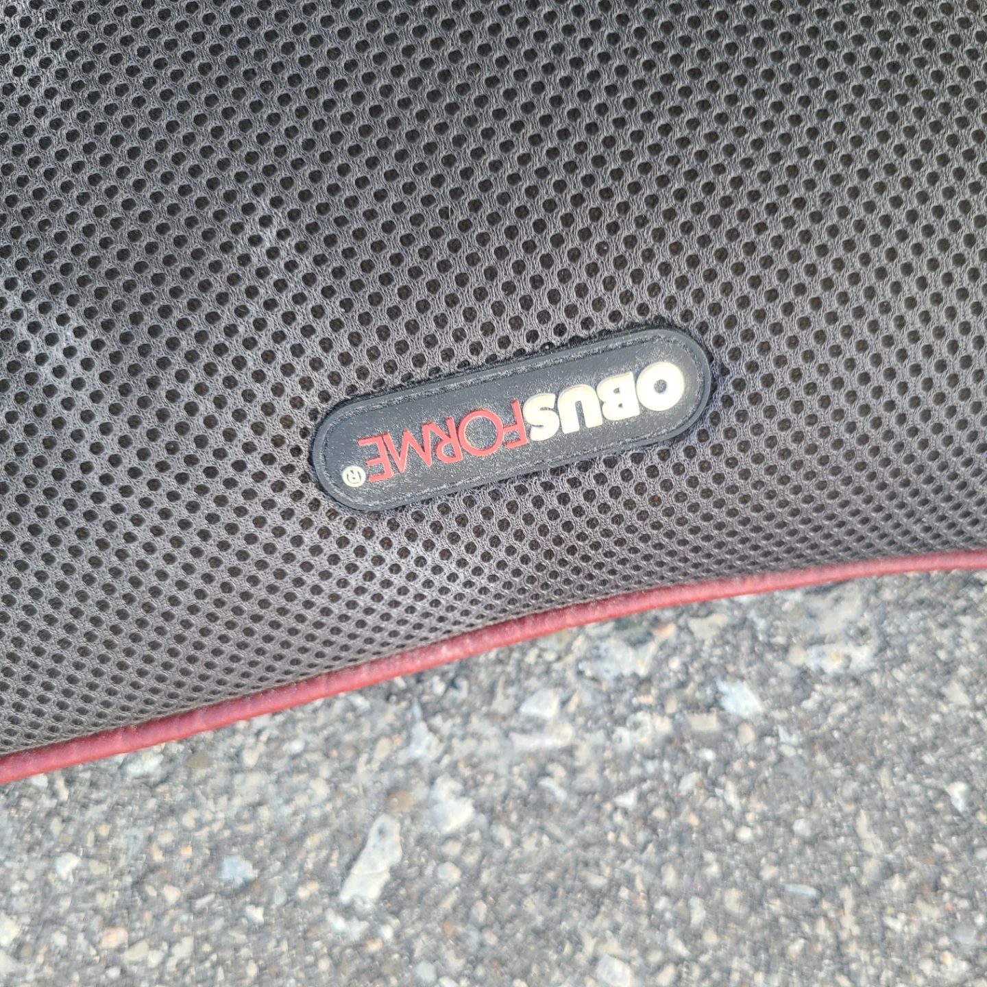 Obusforme massage seat cushion with remote control. It's made with breathable mesh fabric and has red piping accents. This cushion offers a variety of massage functions for your comfort.