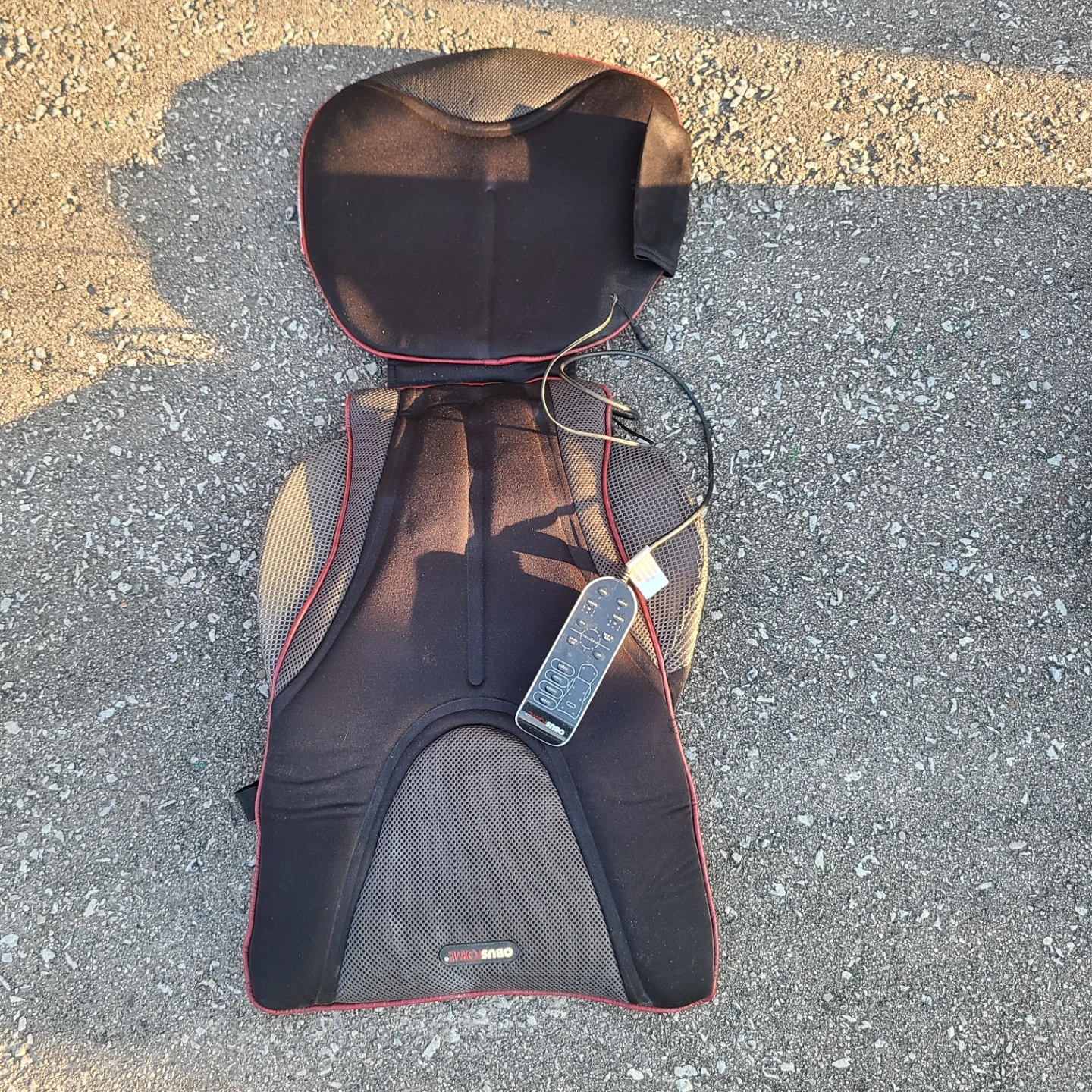 Obusforme massage seat cushion with remote control. It's made with breathable mesh fabric and has red piping accents. This cushion offers a variety of massage functions for your comfort.