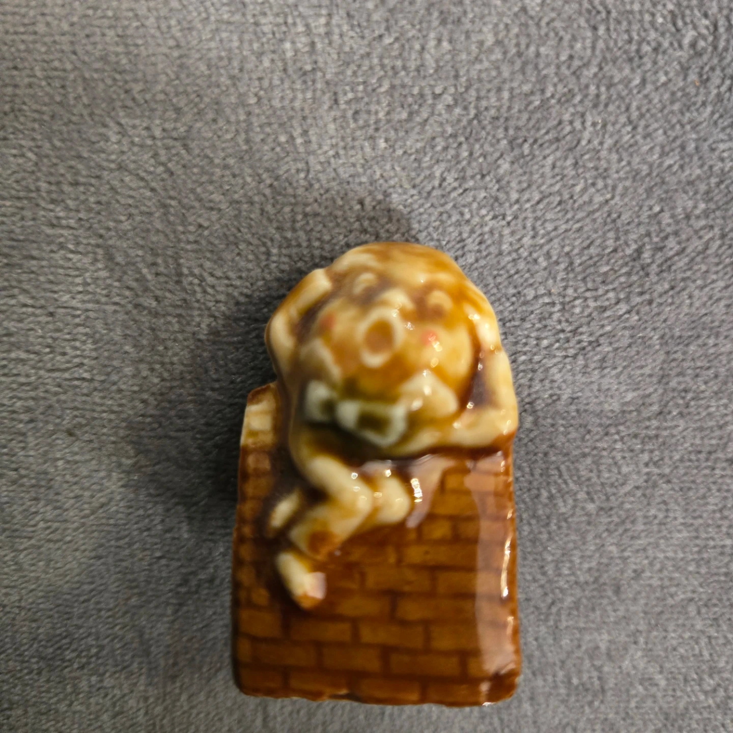 This is a cute humpty dumpty figurine peeking over a brick wall. It's a charming decorative piece. Made of glazed ceramic.