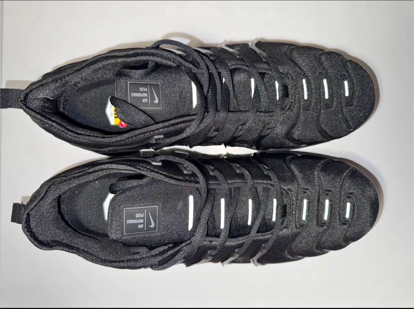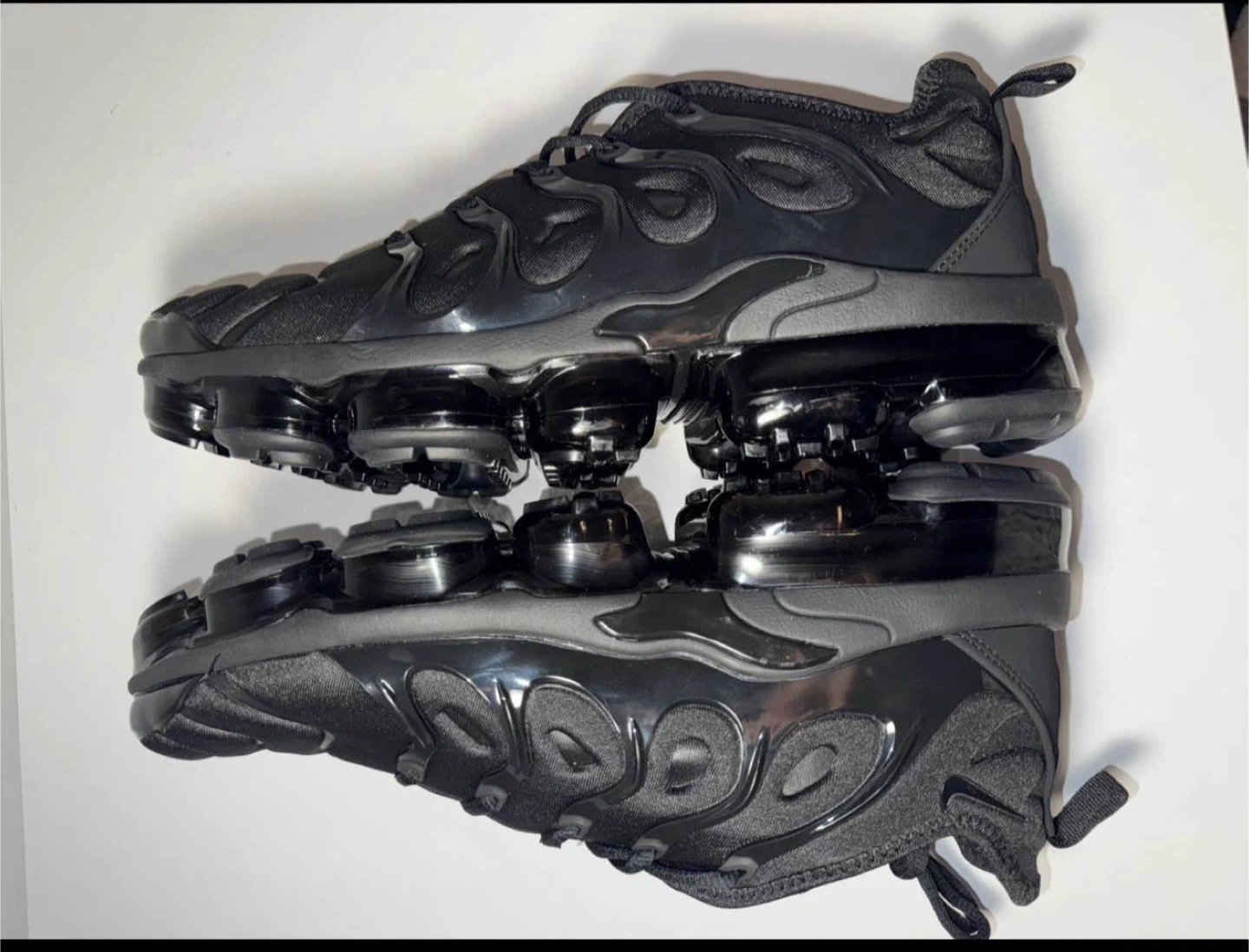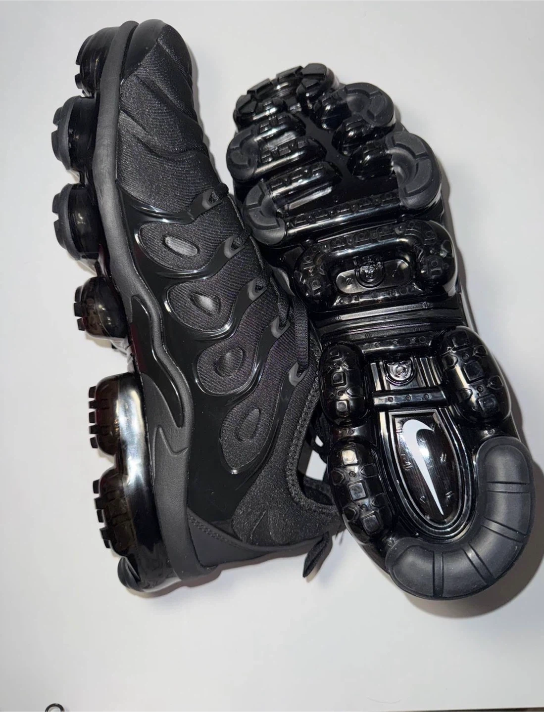 These are black Nike Air Vapormax Plus sneakers. They feature a unique rubber cage overlay. The Vapormax Air technology provides a lightweight, responsive feel.