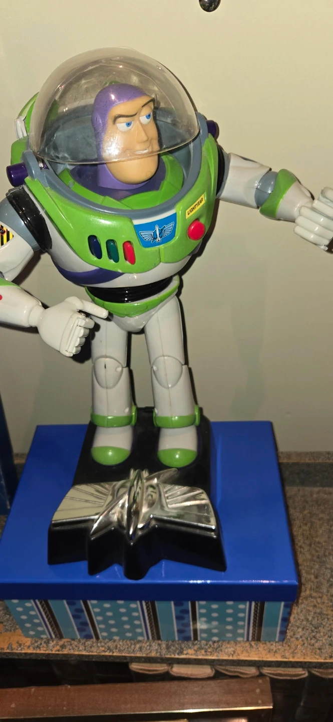 This is a Buzz Lightyear action figure from Disney Pixar's Toy Story. It's a detailed toy with a clear helmet and iconic green and white suit. The figure stands on a decorative base.