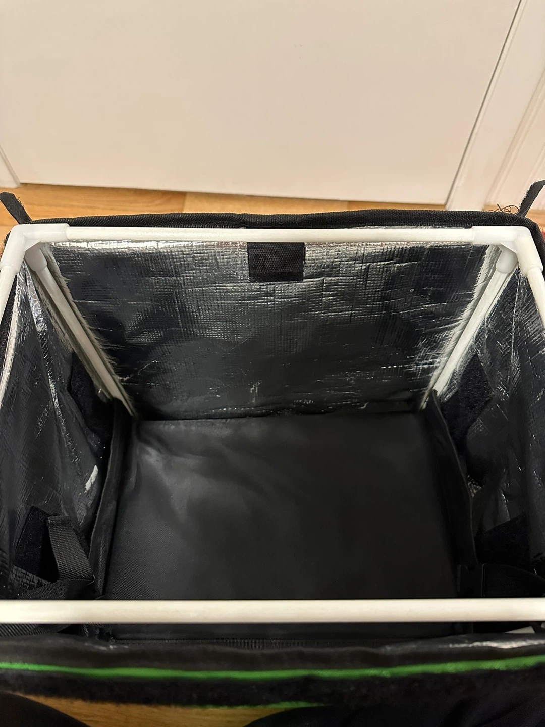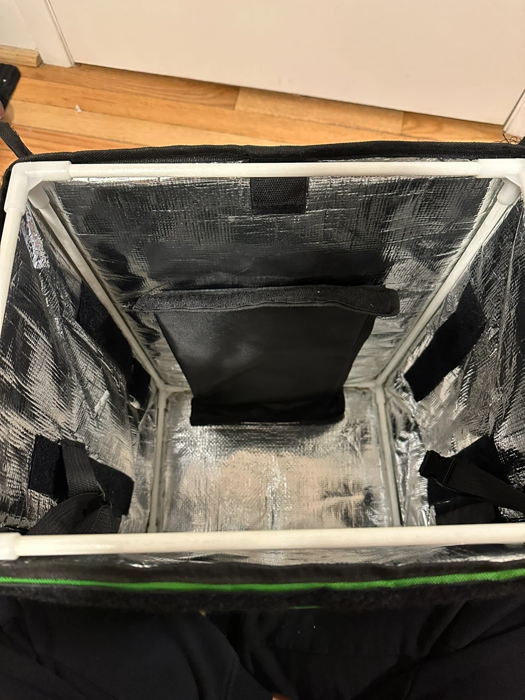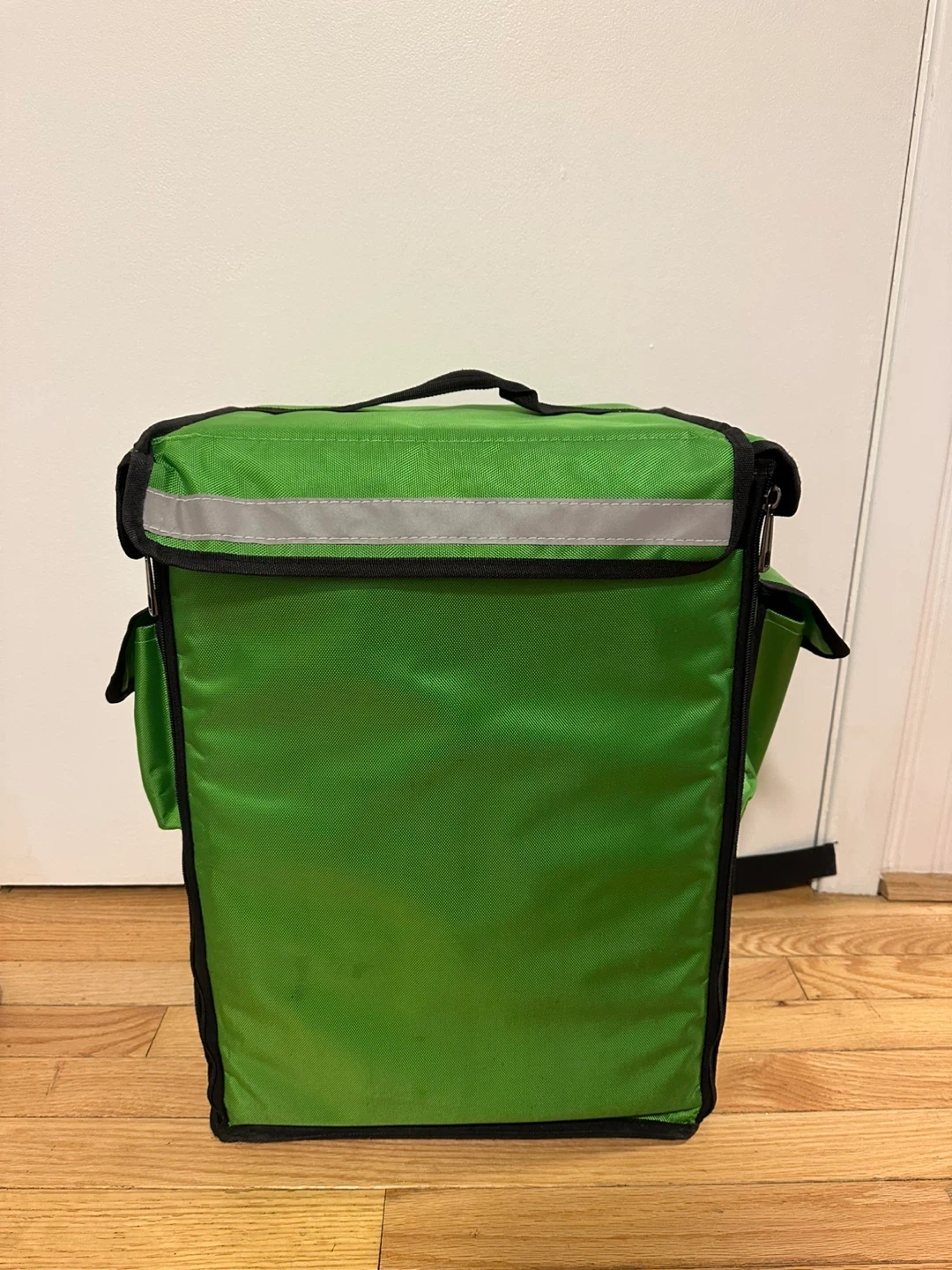 This insulated delivery bag is bright green with black trim and reflective accents. It has a spacious interior with reflective lining. It's perfect for food or grocery delivery services.