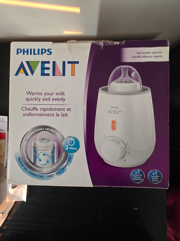 It's a Philips Avent fast bottle warmer. The box is still in great shape. Inside the box, there is the bottle warmer itself, the cord, and some manuals. Using this bottle warmer can bring you much-needed peace of mind during those late-night feedings.