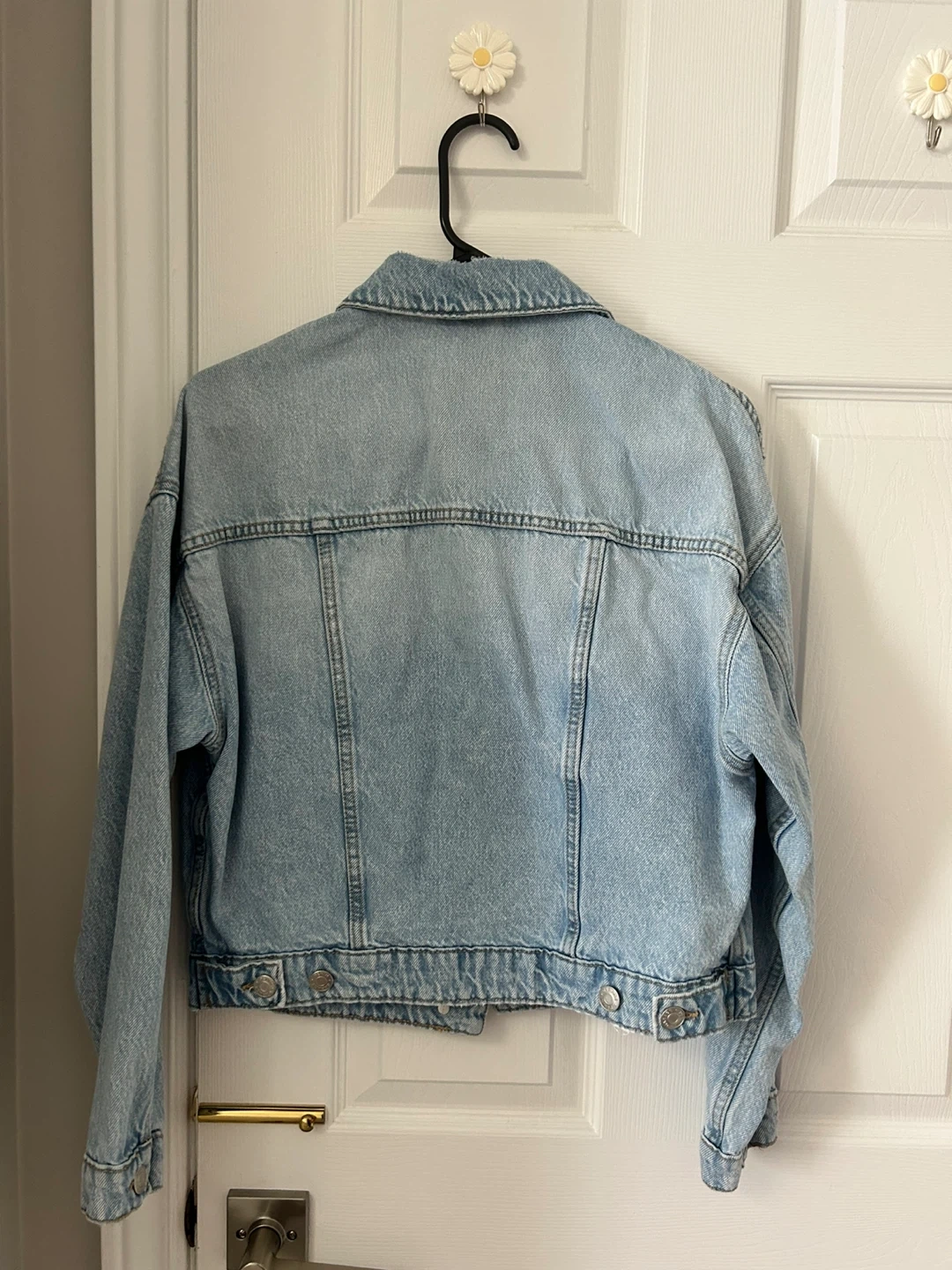 It's a light wash denim jacket. Made from 100% cotton. Classic trucker style with button closures.