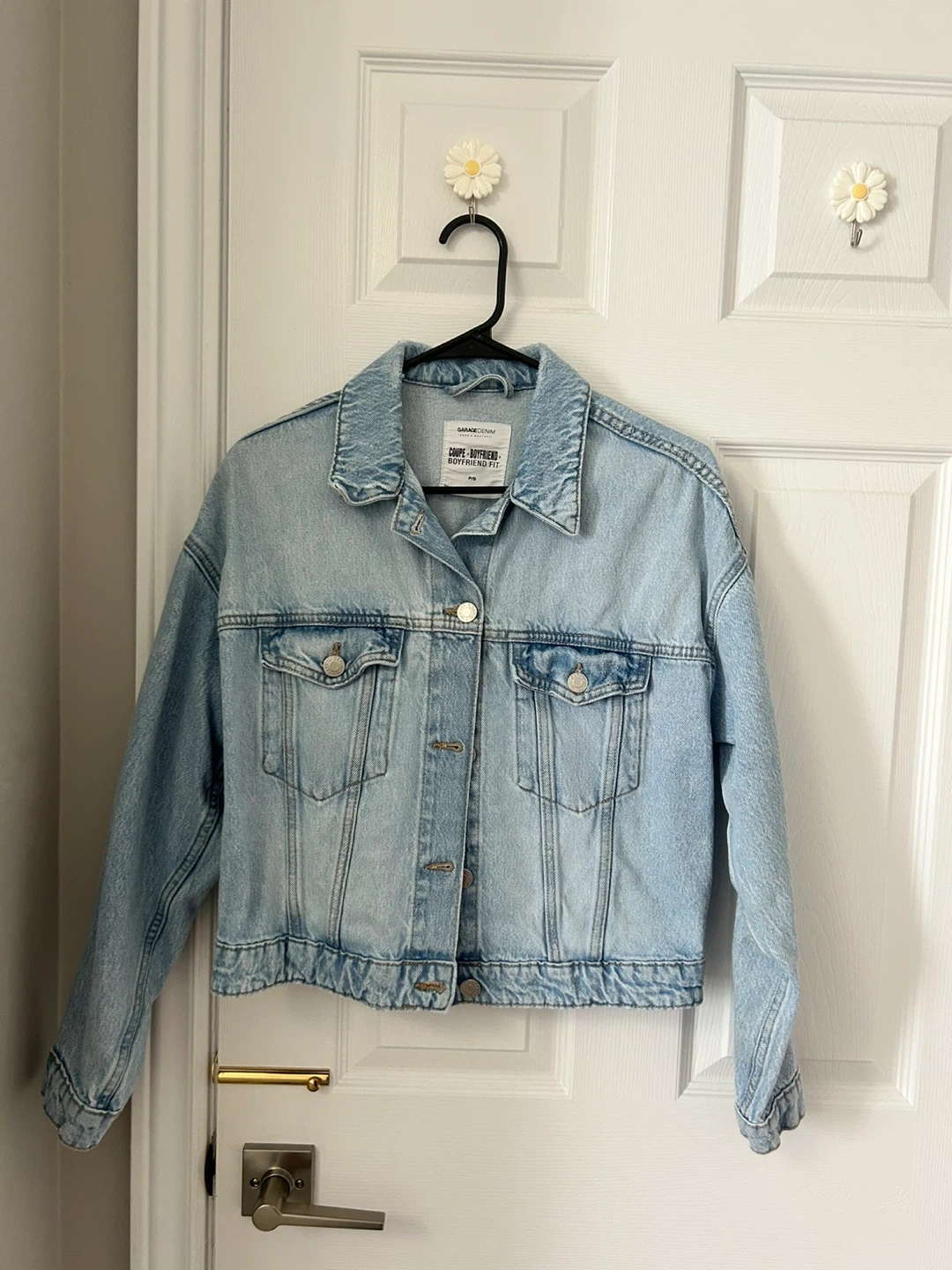 It's a light wash denim jacket. Made from 100% cotton. Classic trucker style with button closures.