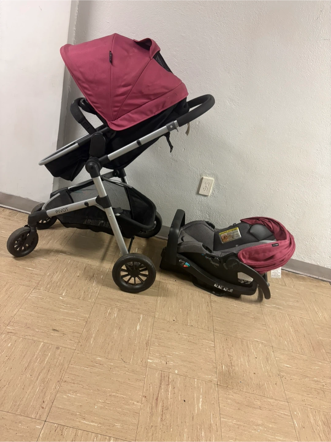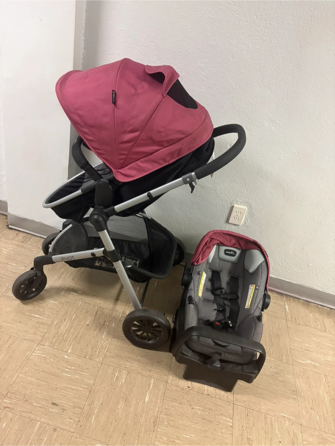 This Evenflo Pivot travel system includes a stroller and infant car seat. The stroller has a reversible seat and a large canopy. The car seat has a secure base and adjustable harness. It's a convenient setup for on-the-go parents!