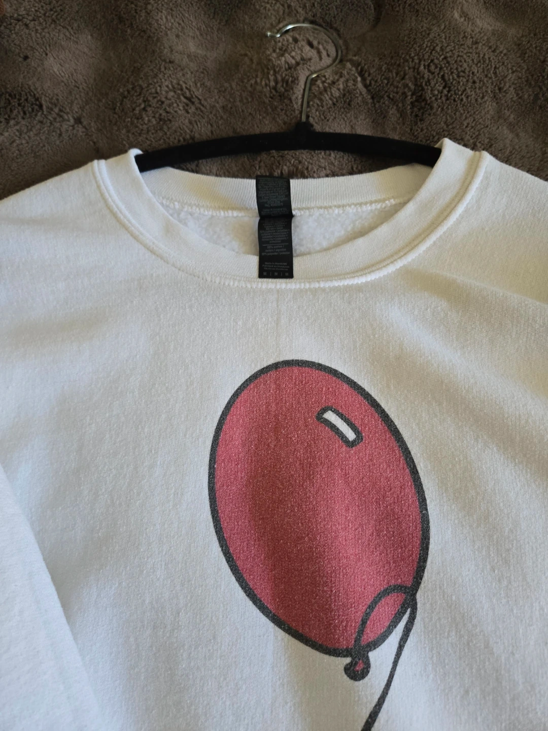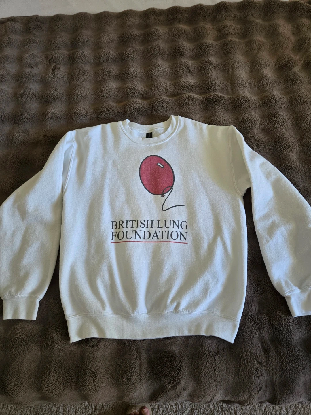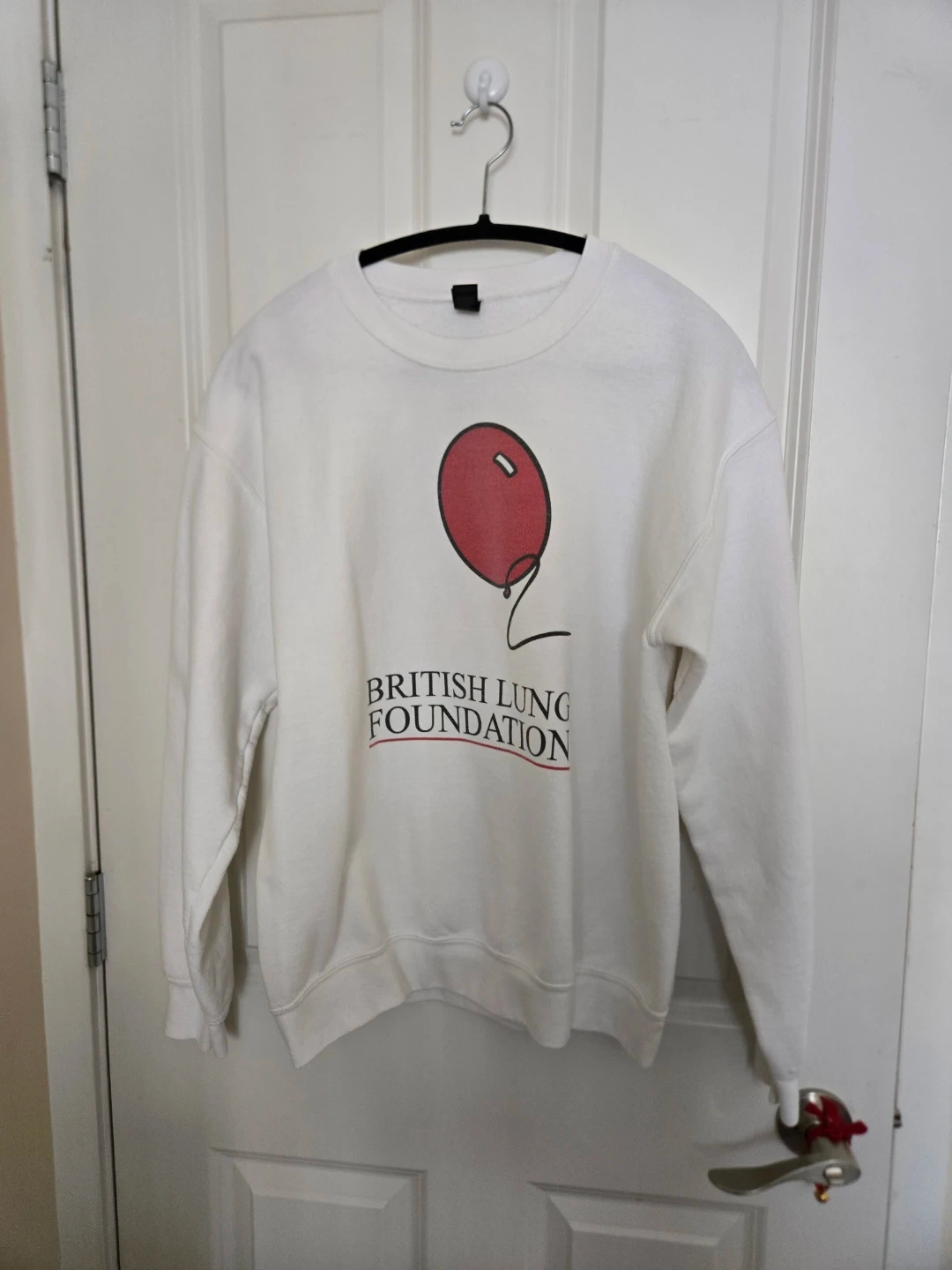 White crewneck sweatshirt with a red balloon graphic and "British Lung Foundation" text. Cotton blend material. Great for casual wear!The iconic sweatshirt princess Diana wore!