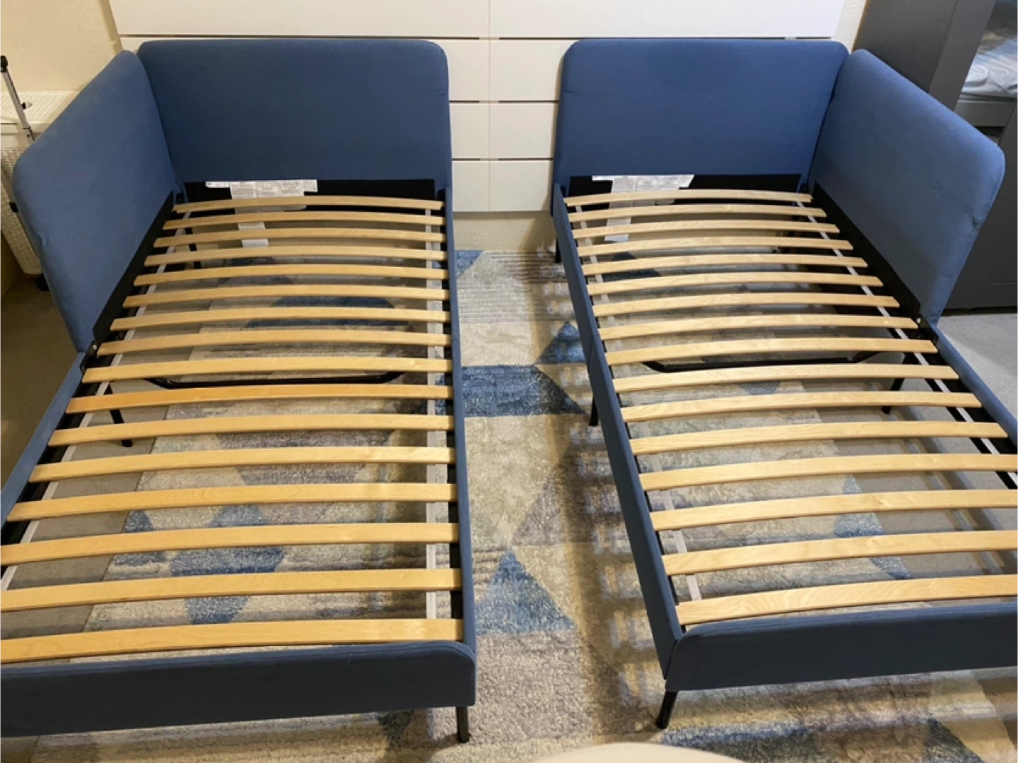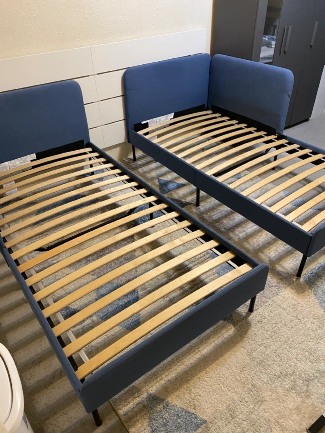 Selling a 2 single IKEA bed frame as a set in blue. It's in great shape and ready for a new home. Perfect for a kid's room smoke and pet free.