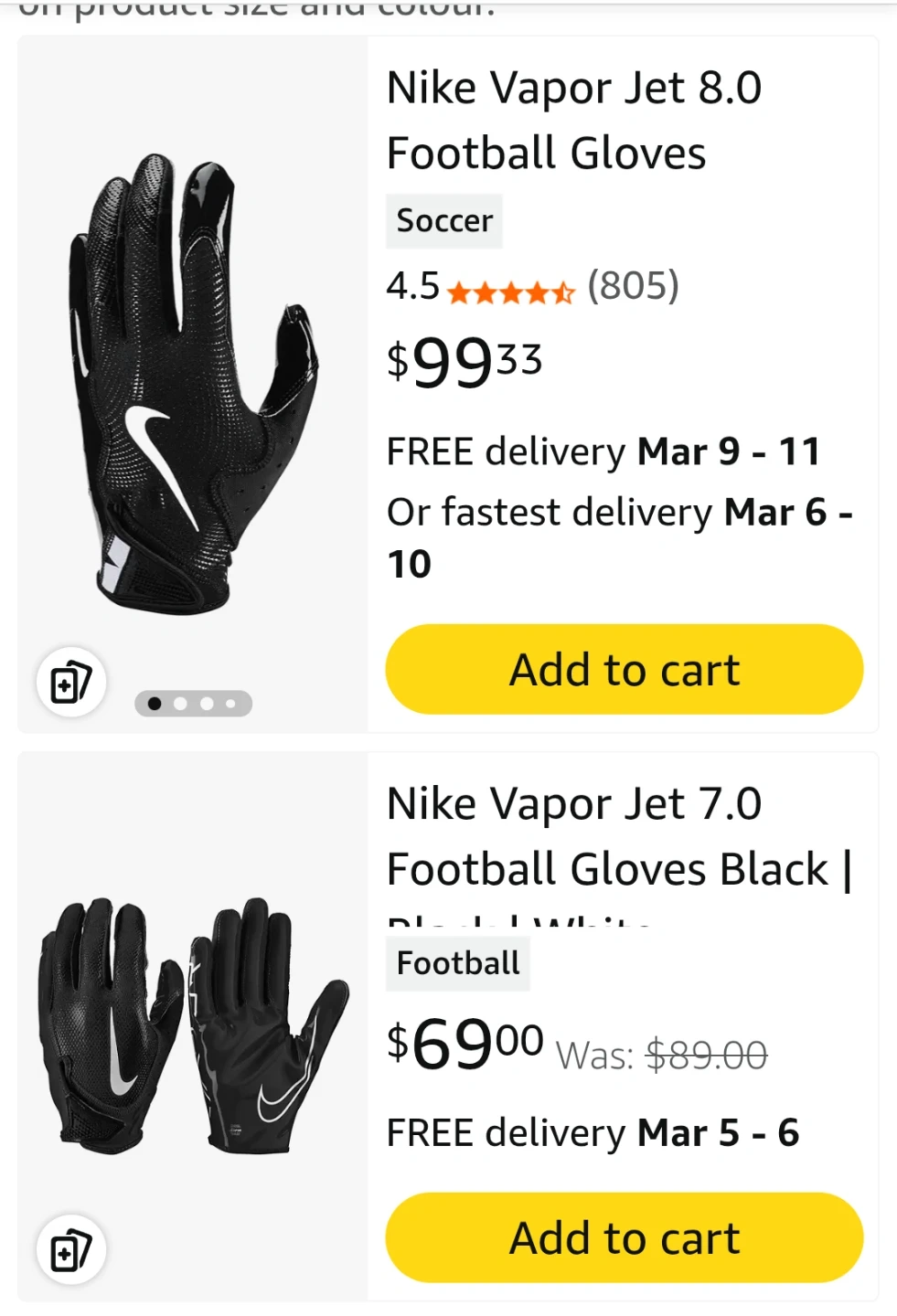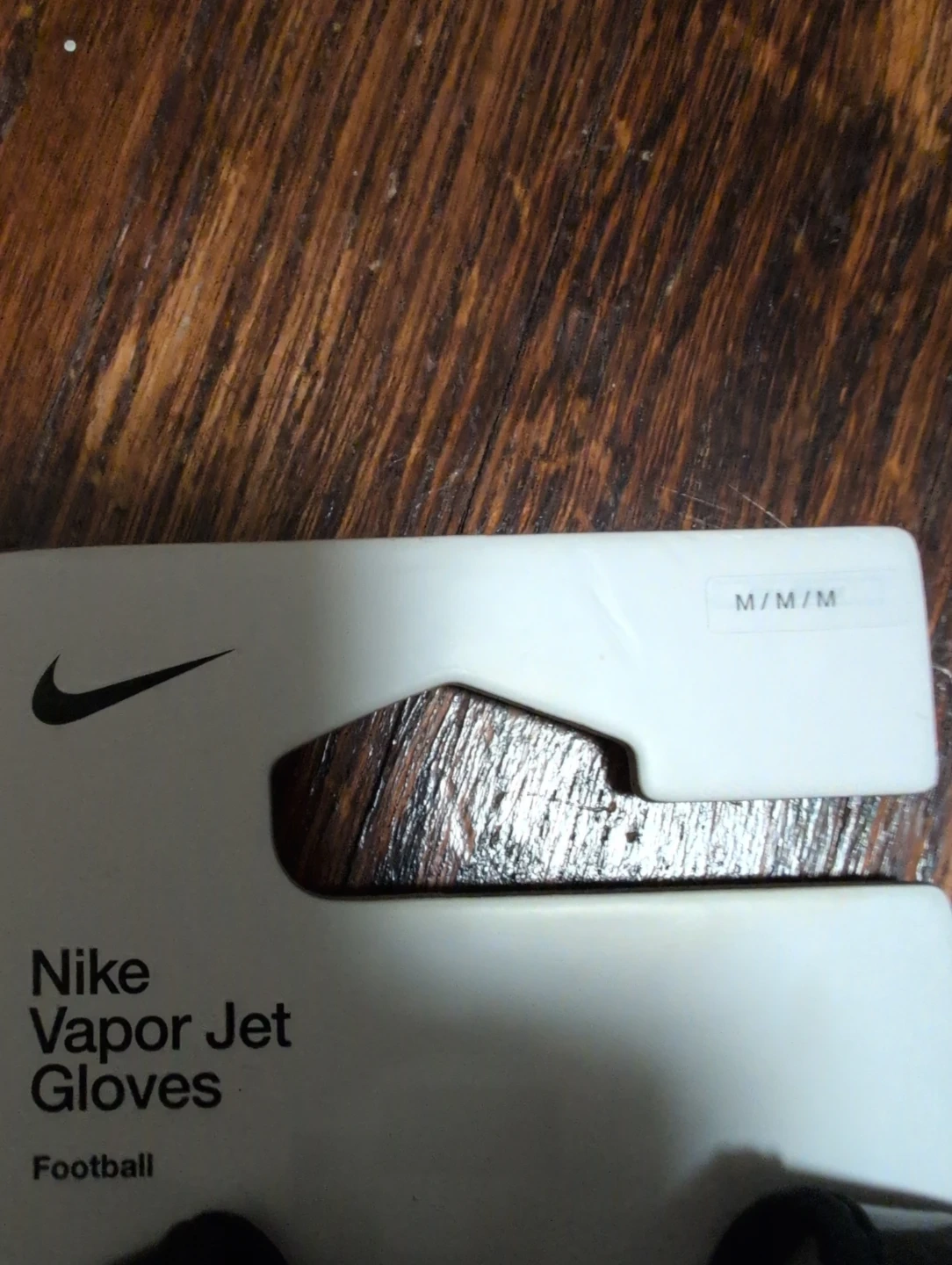 These brand new Nike Vapor Jet football gloves are black. They're a size medium. The gloves feature Magnigrip palms for a secure catch and an adjustable elastic strap at the wrist for a no-distraction fit. They're flexible, lightweight, and breathable.