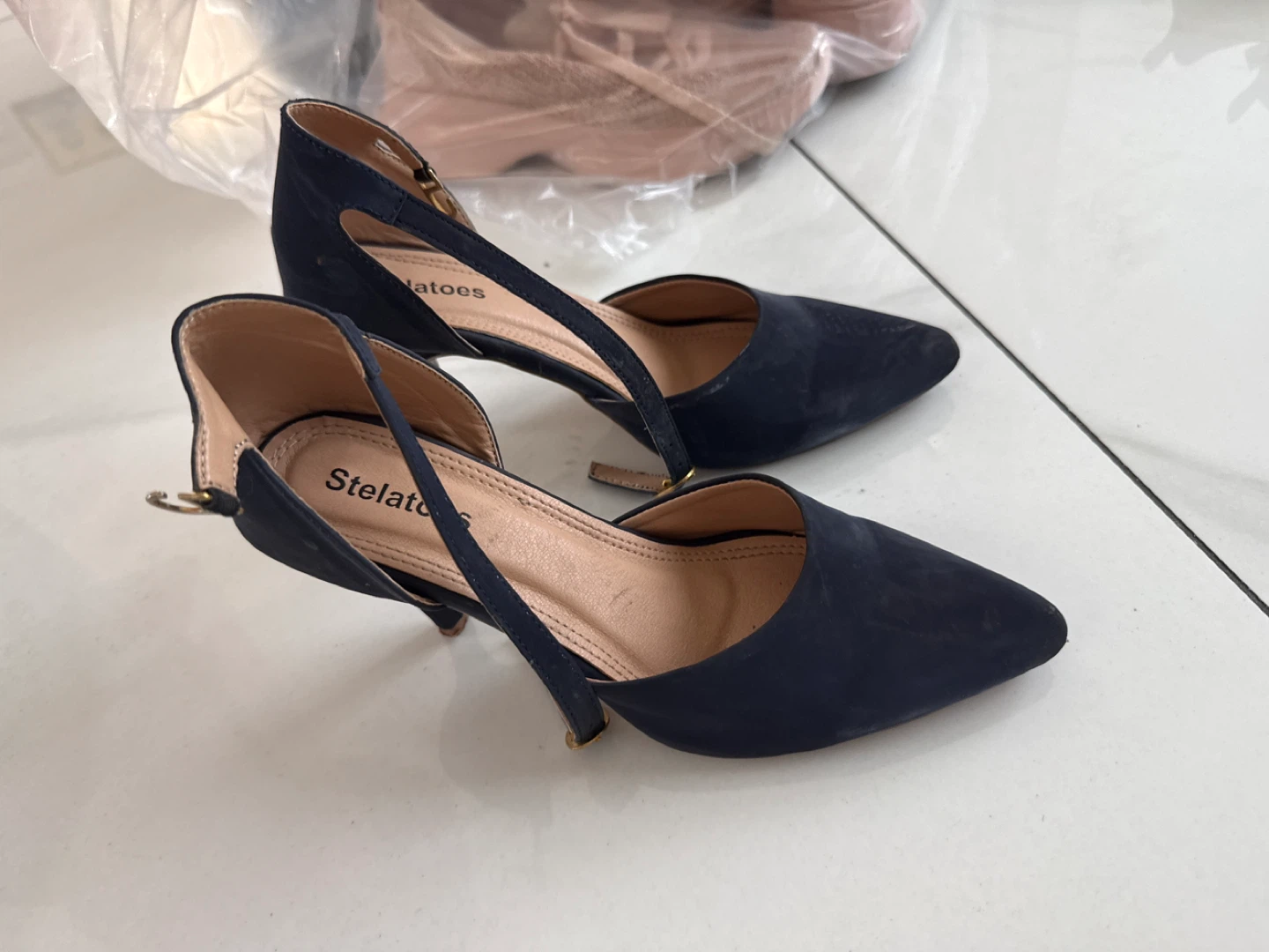 Stelatos navy blue heeled shoes with an ankle strap. Suede-like material. Pumps with a pointed toe.