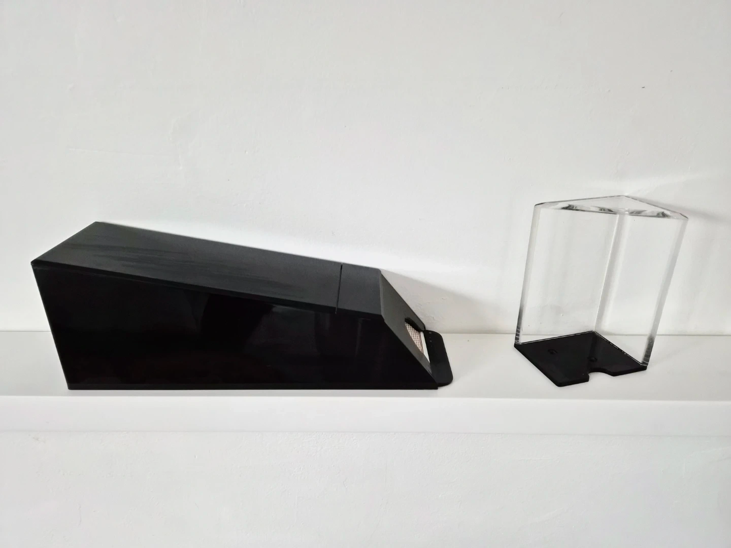 This set includes a black acrylic dealer shoe and a clear acrylic card tray. The shoe is designed to hold a deck of cards for shuffling and dealing. Perfect Black Jack Players