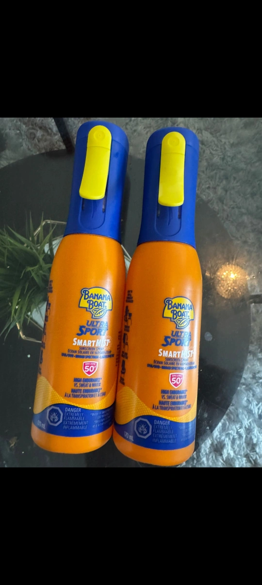 Selling two bottles of Banana Boat Ultra Sport SmartMist Sunscreen with SPF 50. Perfect for staying protected during outdoor activities!