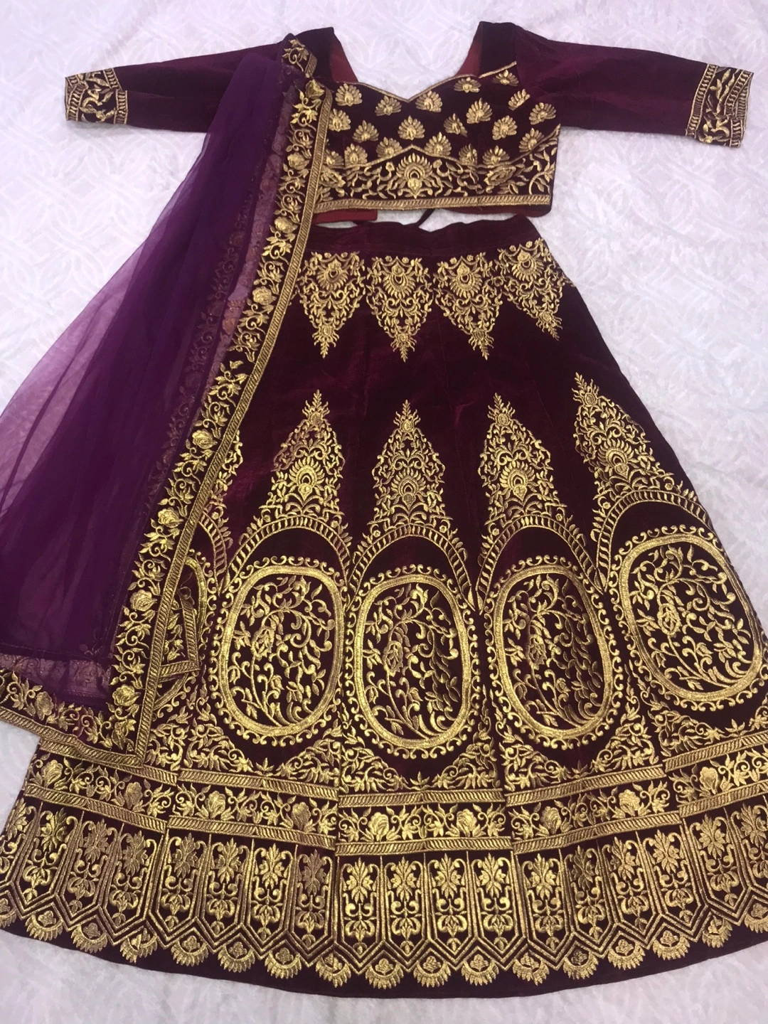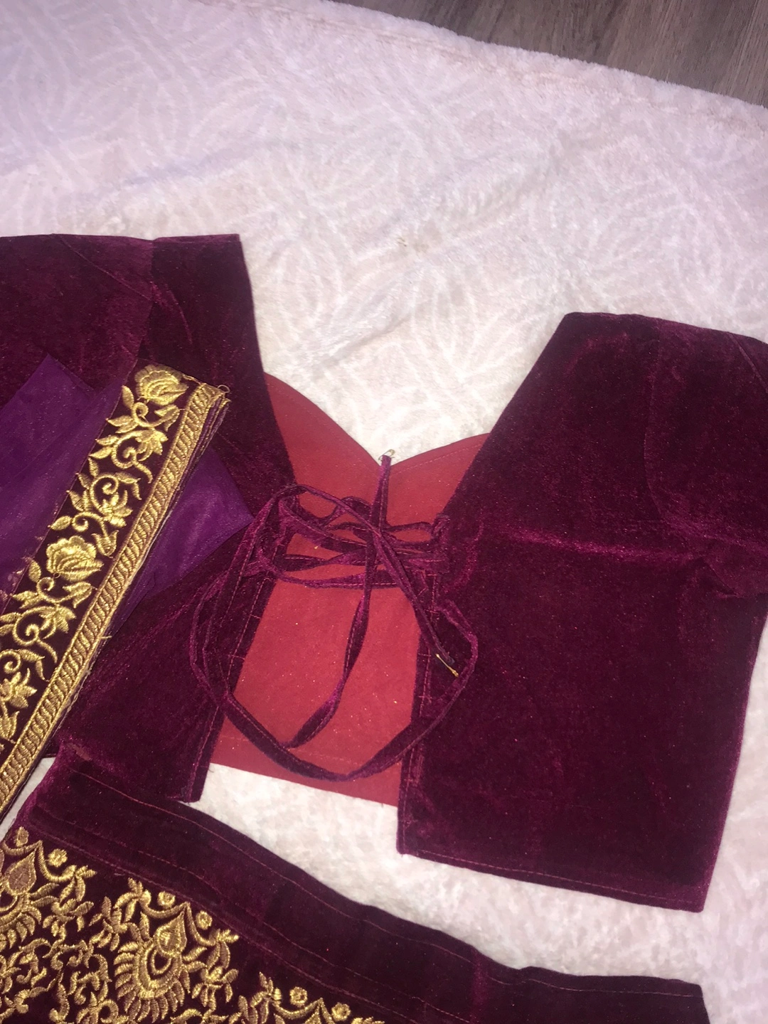 Beautiful burgundy velvet lehenga choli set with intricate gold embroidery. Perfect for weddings or special occasions. Includes the skirt, top, and dupatta.