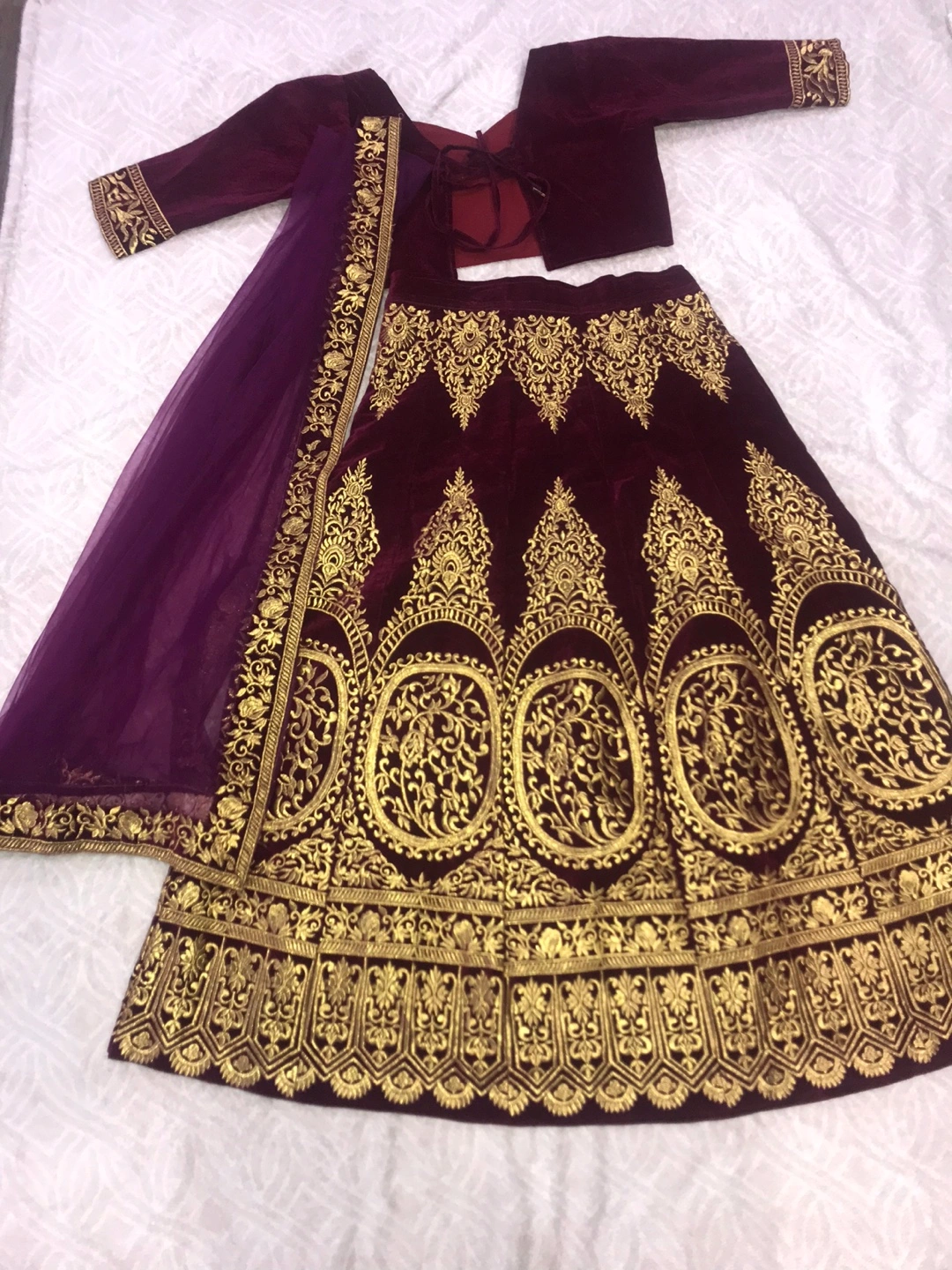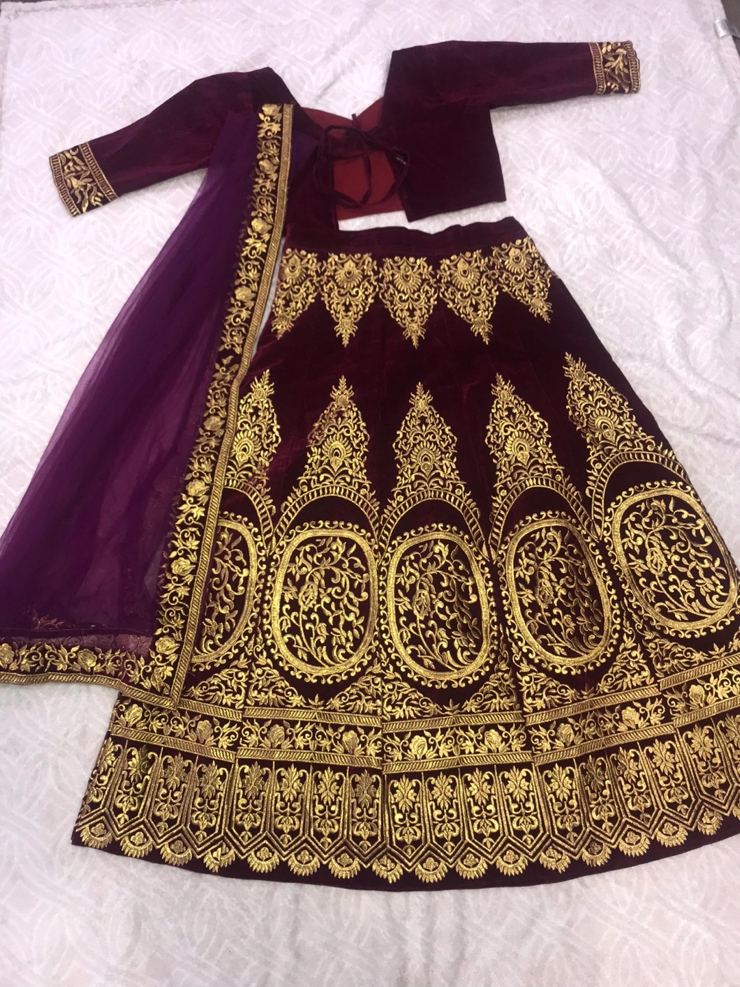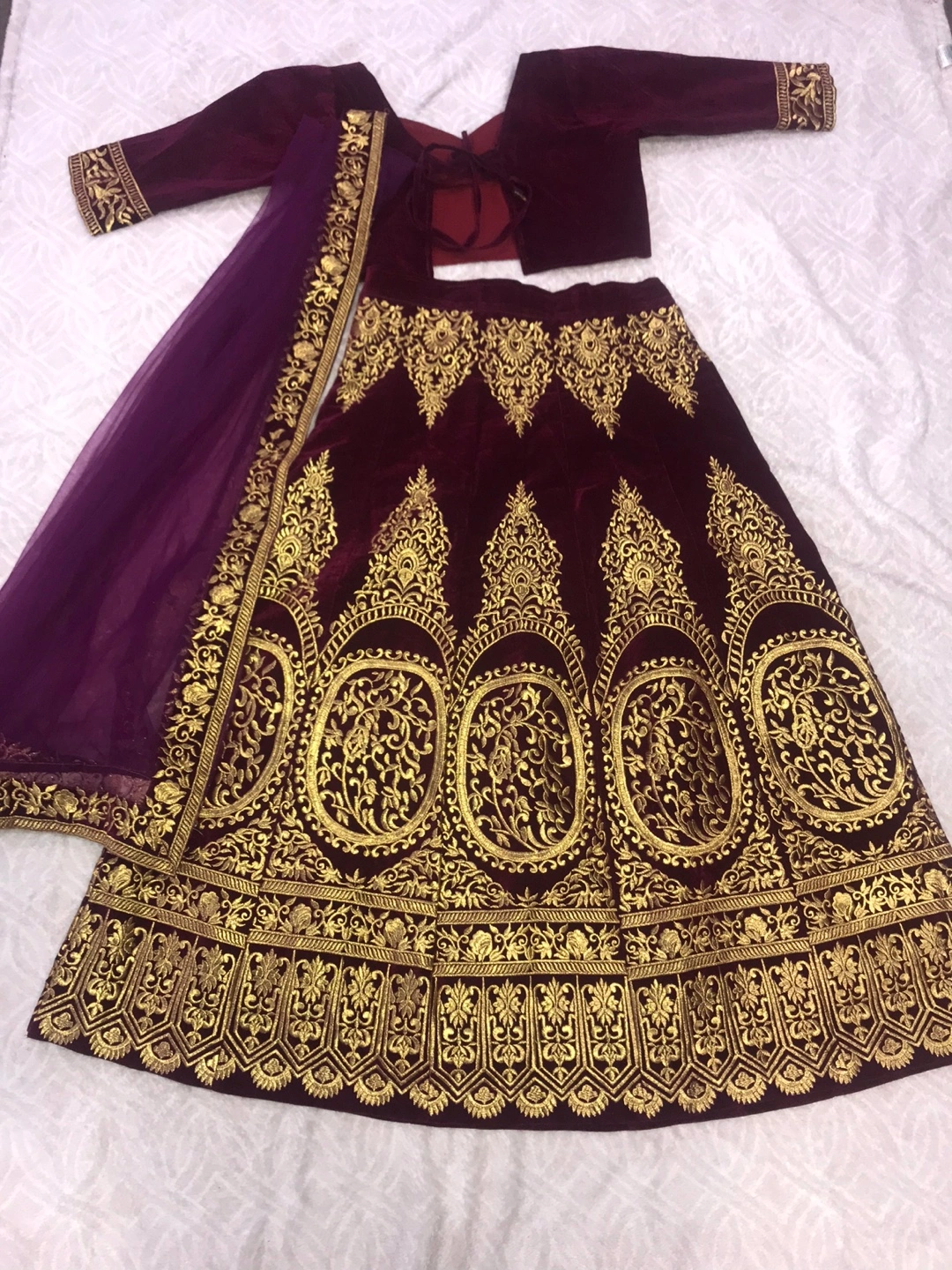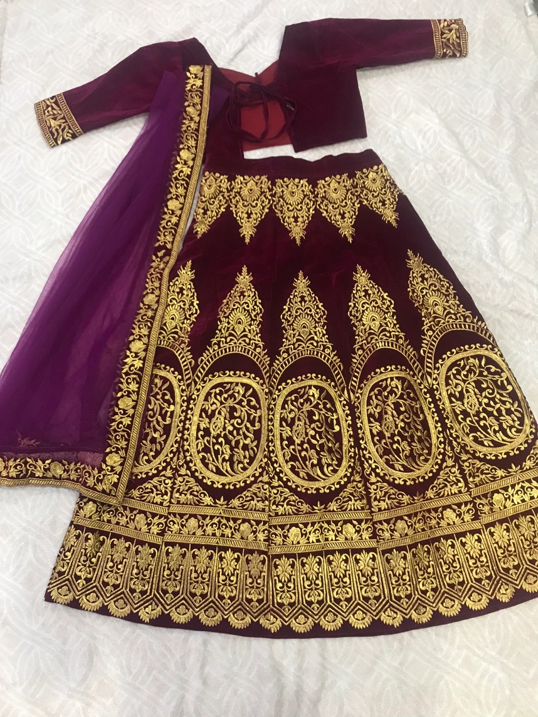 Beautiful burgundy velvet lehenga choli set with intricate gold embroidery. Perfect for weddings or special occasions. Includes the skirt, top, and dupatta.