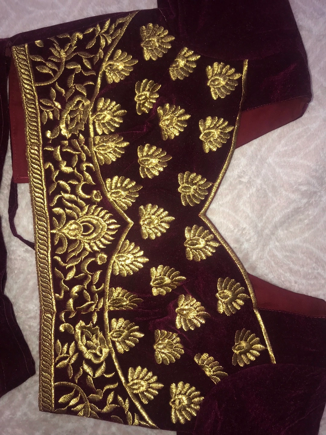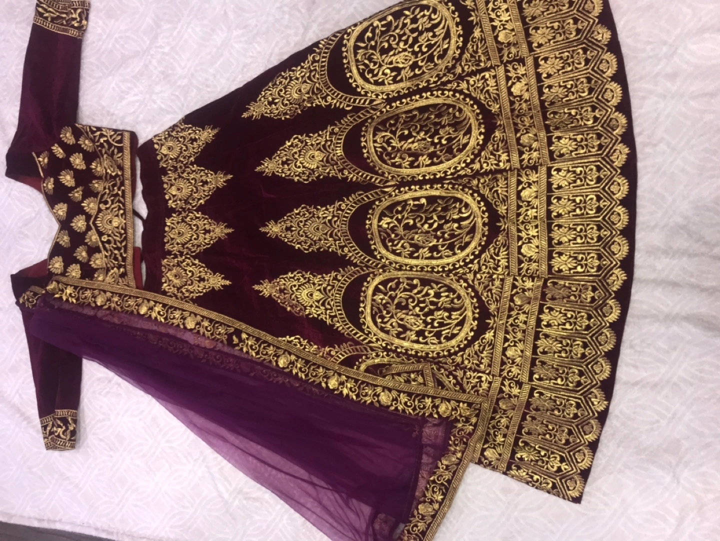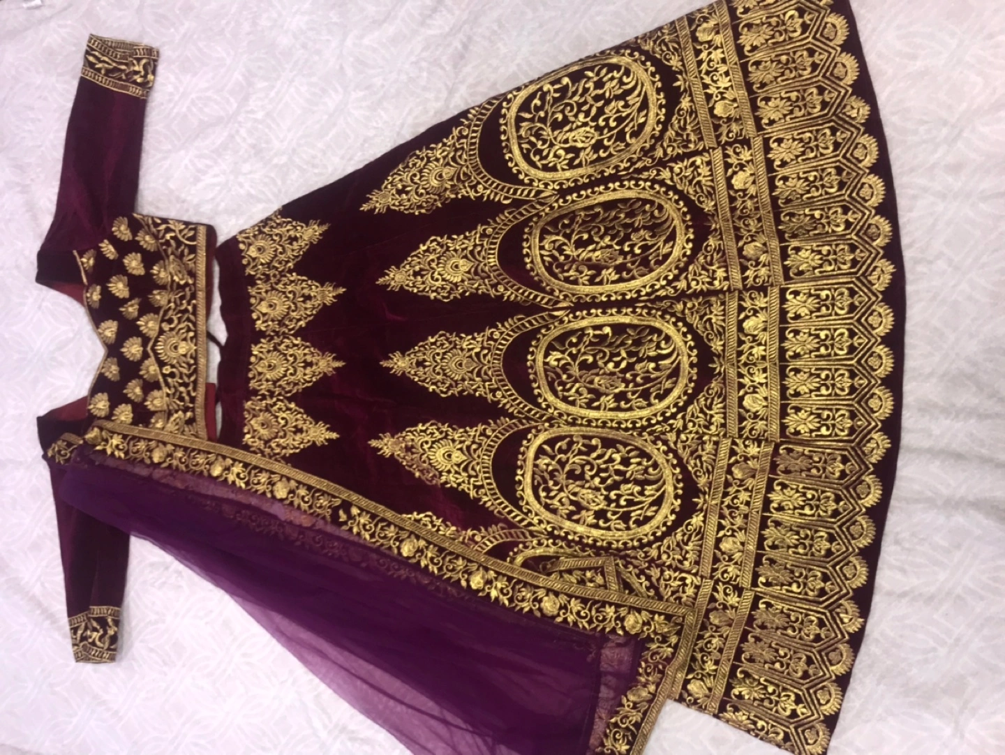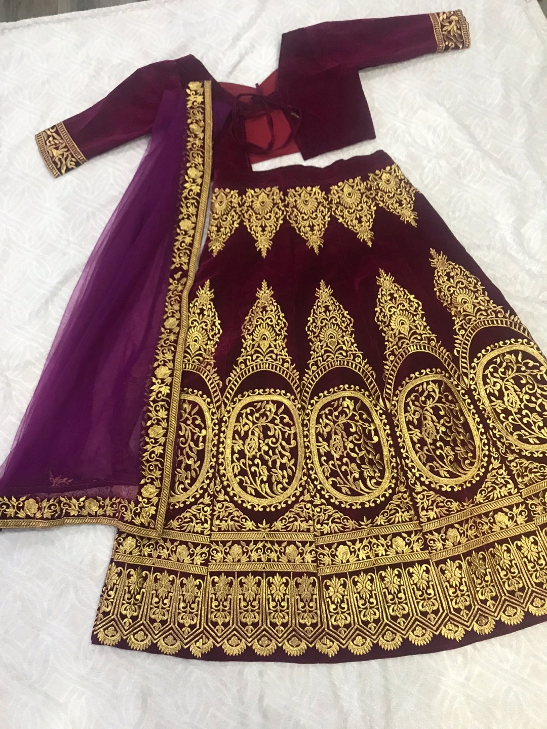 Beautiful burgundy velvet lehenga choli set with intricate gold embroidery. Perfect for weddings or special occasions. Includes the skirt, top, and dupatta.