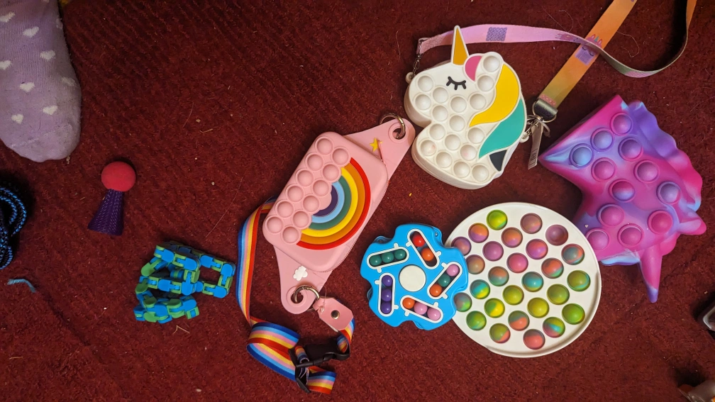 Selling a collection of fun fidget toys including a unicorn pop it purse, a rainbow fanny pack pop it, a round pop it, a unicorn head pop it, a blue fidget toy, and a blue and green fidget toy