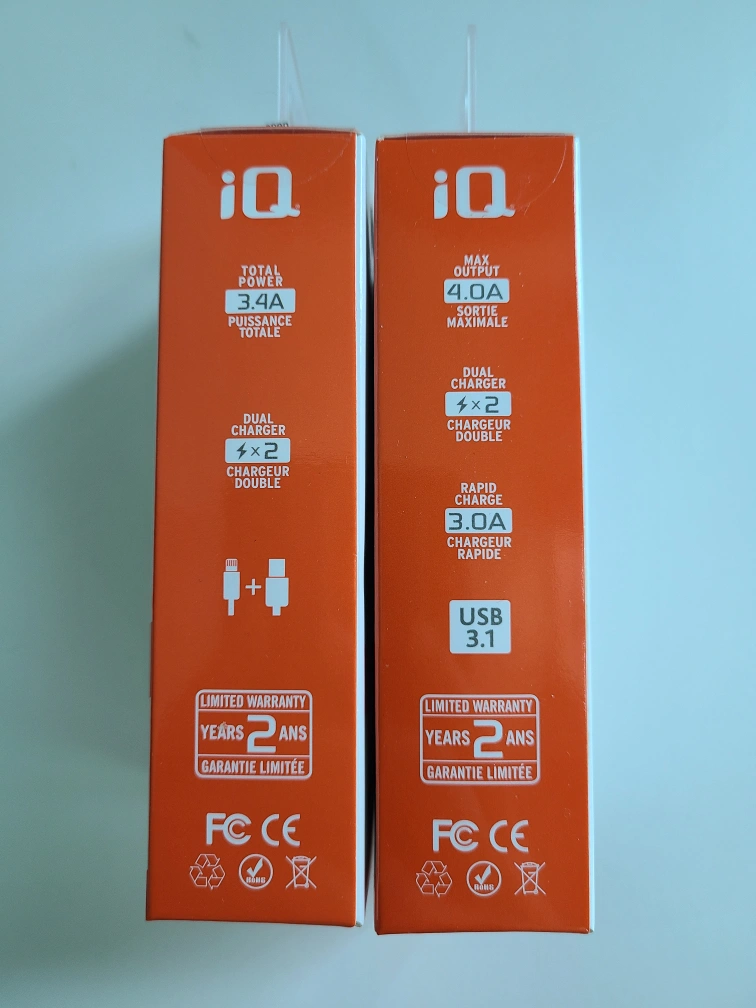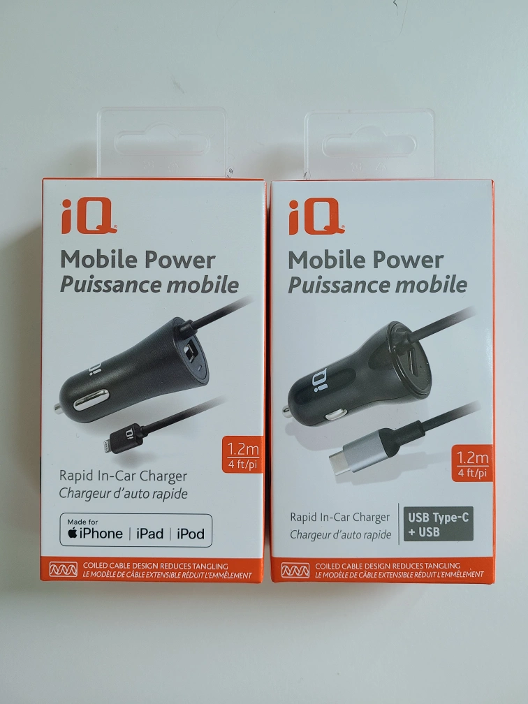 Selling two brand new iQ Mobile Power rapid in-car chargers! One is a Lightning Dual charger with 3.4A total power output, and the other is a USB Type-C charger with 4.0A max output. Both feature a coiled cable design to reduce tangling, making them super convenient for charging your devices on the go