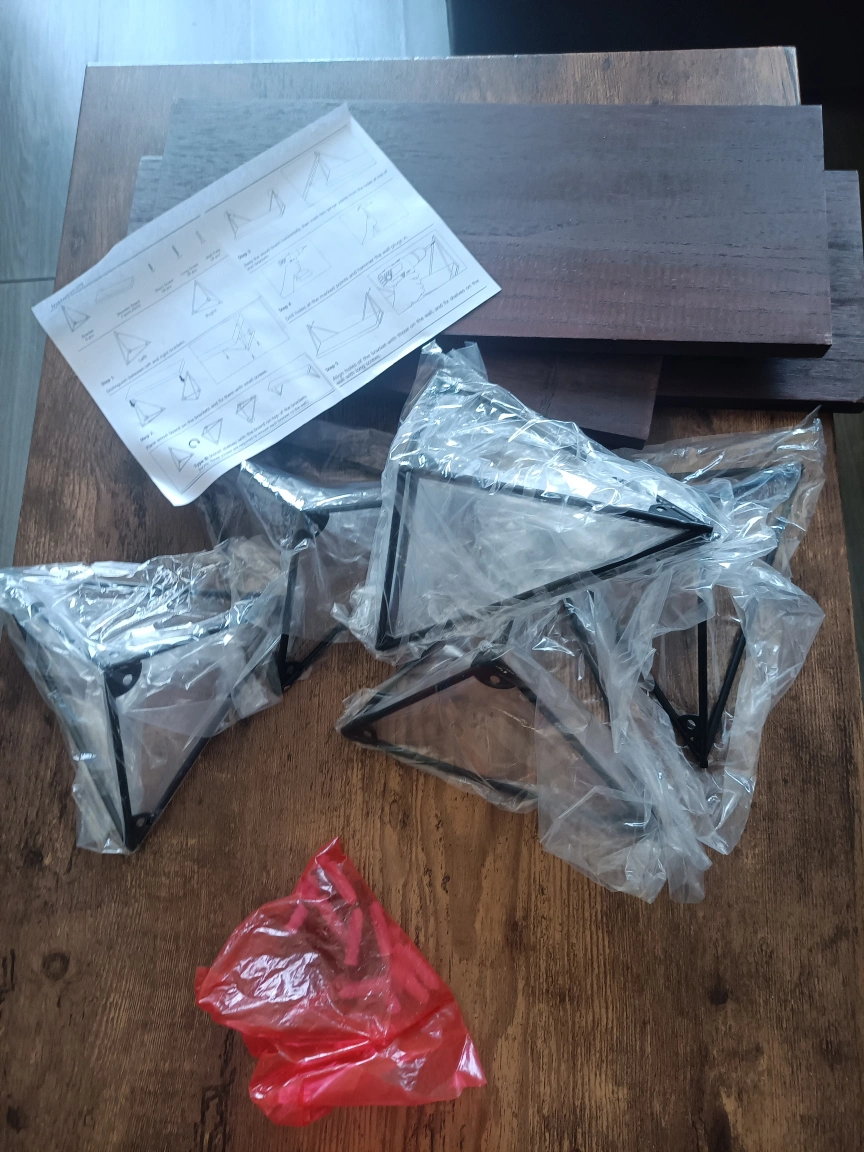 Selling a set of shelf brackets and wood planks. They appear to be in new condition and include the instructions for installation. Ready to give your space a stylish and functional upgrade