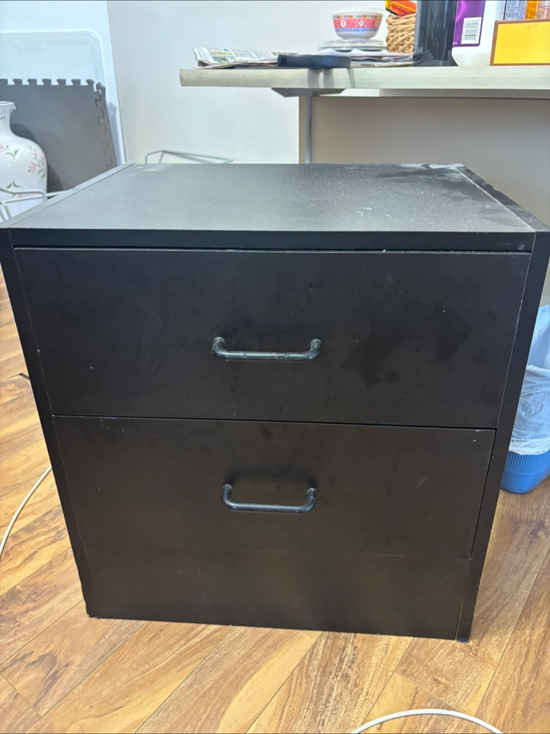 Selling a black bedside table with two drawers. It's perfect for storing your nighttime essentials! It's in great condition and ready for a new home