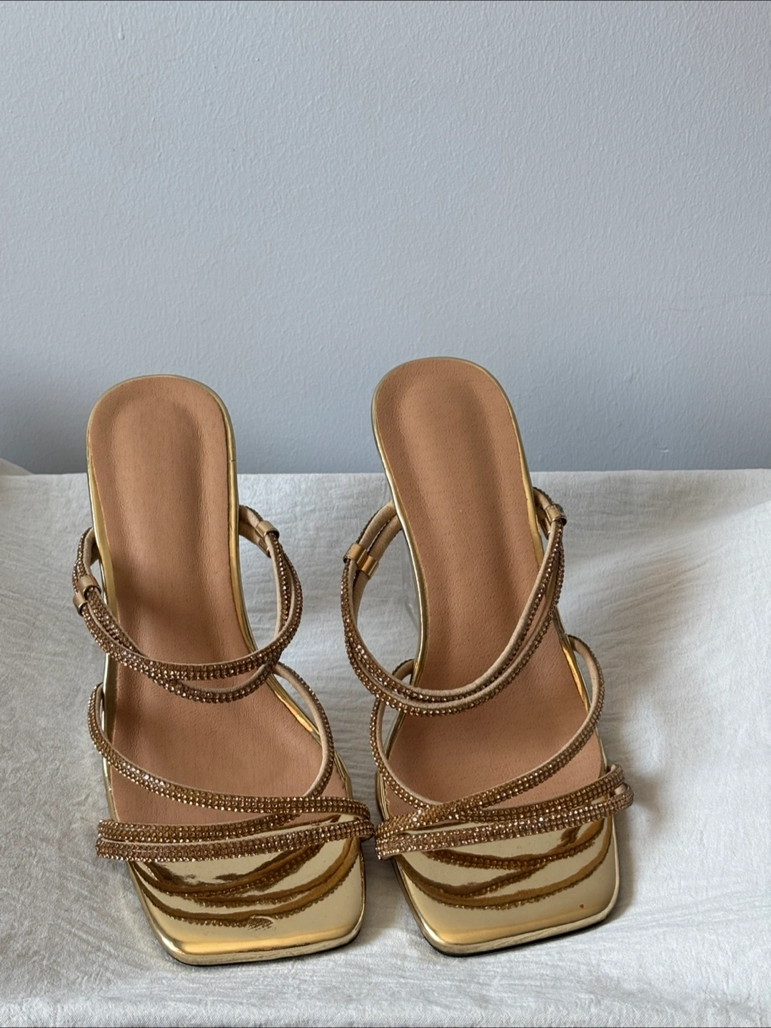 These stylish gold heels feature a unique clear block heel design. They're perfect for adding a touch of glamour to any outfit. The strappy design is adorned with small rhinestones, adding a bit of sparkle. ✅Willing to meet-up halfway for purchase over $50 ✅Check out my other listing (all clothes for $5) ✅Pick-up and cash only