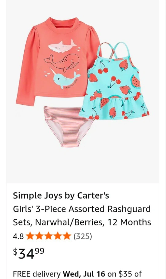 Super cute Simple Joys by Carter's swimsuit set for your little one! This set includes a rashguard, a swimsuit top, and bottoms. Perfect for babies aged 3-6 months!