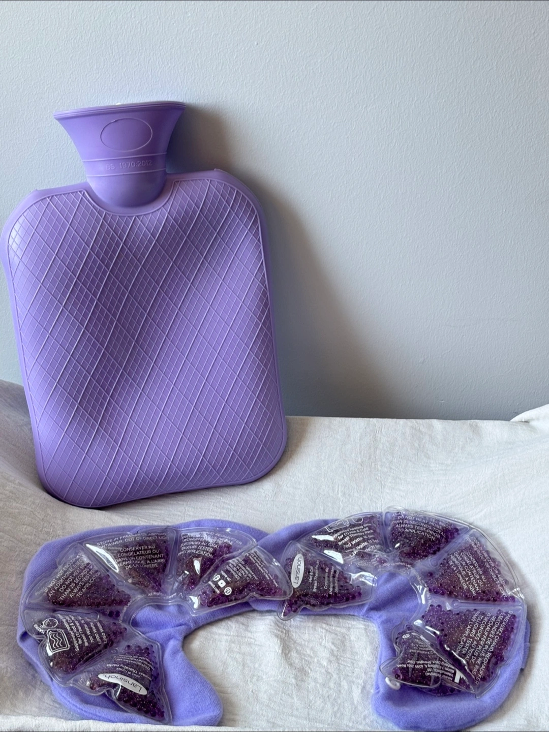 Selling a Lansinoh Breast Therapy Pack along with a hot water bottle, both in purple! The breast therapy pack can be used either hot or cold to help with breastfeeding. They're both in good condition and ready for a new home.